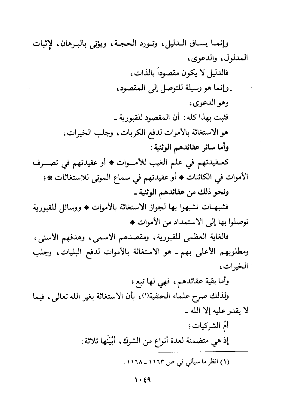 وإنما يساق الدليل، وتورد الحجة، ويؤتى بالبرهان، لإثبات المدلول، والدعوى، فالدليل لا يكون مقصودا بالذات، - وإنما هو وسيلة للتوصل إلى المقصود، وهو الدعوى، فثبت بهذا كله: أن المقصود للقبورية- هو الاستغاثة بالأموات لدفع الكربات، وجلب الخيرات، وأما سائر عقائدهم الوثنية: