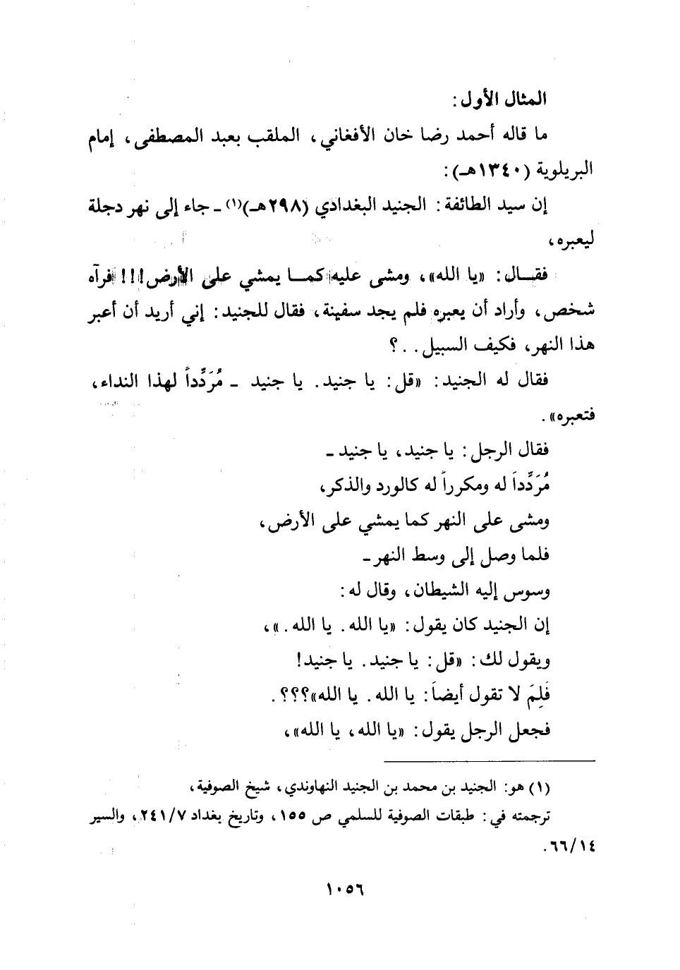 إن سيد الطائفة: الجنيد البغدادي (298هـ) - جاء إلى نهر دجلة ليعبره، فقال: " يا الله "، ومشى عليه كما يمشي على الأرض!!! فرآه شخص، وأراد أن يعبره فلم يجد سفينة، فقال للجنيد: إني أريد أن أعبر هذا النهر، فكيف السبيل..؟ فقال له الجنيد: " قل: يا جنيد. يا جنيد - مُرَدِّدا لهذا النداء، فتعبره ".