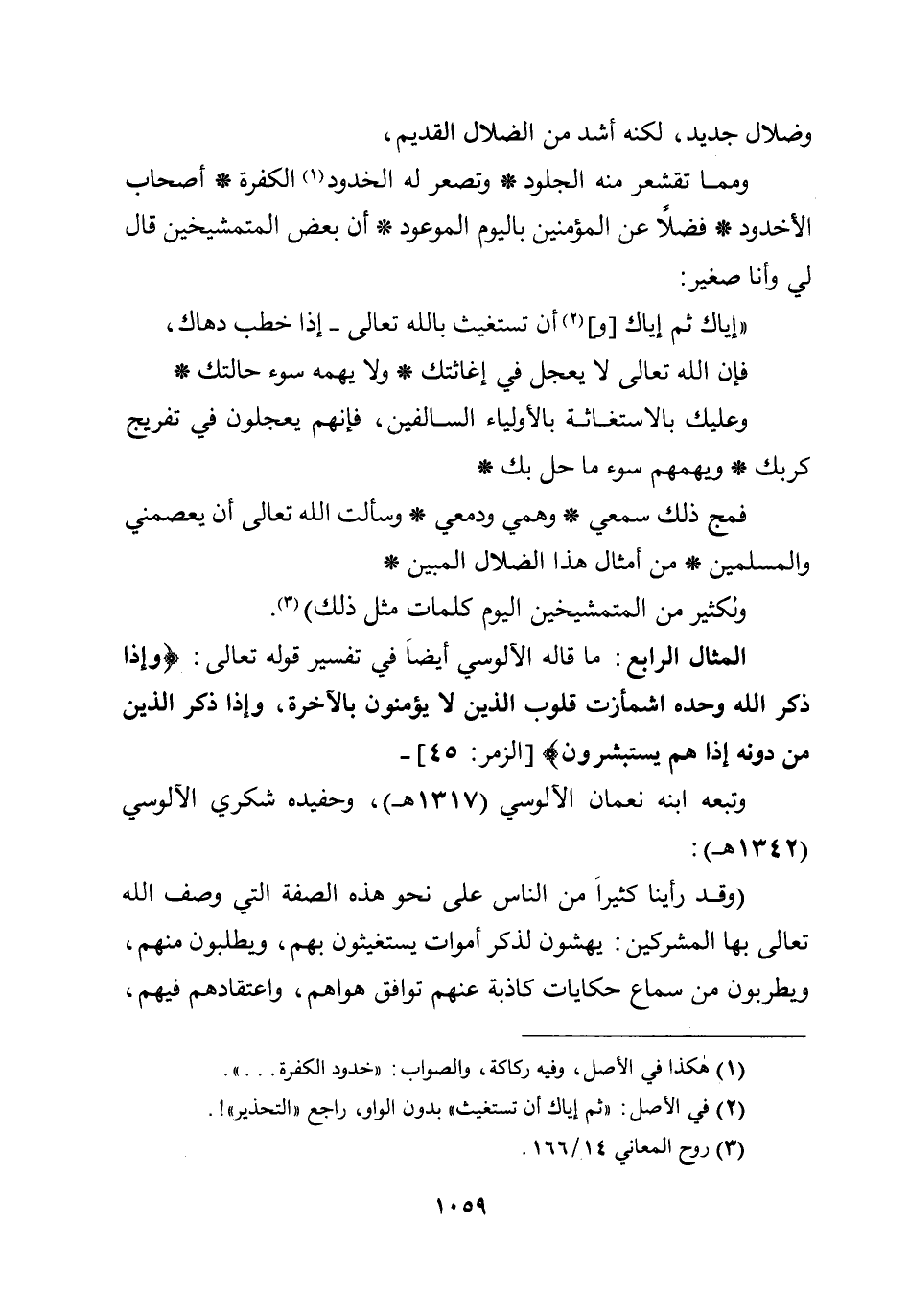 " إياك ثم إياك [و] أن تستغيث بالله تعالى- إذا خطب دهاك، فإن الله تعالى لا يعجل في إغاثتك * ولا يهمه سوء حالتك* وعليك بالاستغاثة بالأولياء السالفين، فإنهم يعجلون في تفريج كربك* ويهمهم سوء ما حل بك* فمج ذلك سمعي* وهمي ودمعي * وسألت الله تعالى أن يعصمني والمسلمين* من أمثال هذا الضلال المبين * ولكثير من المتمشيخين اليوم كلمات مثل ذلك) .