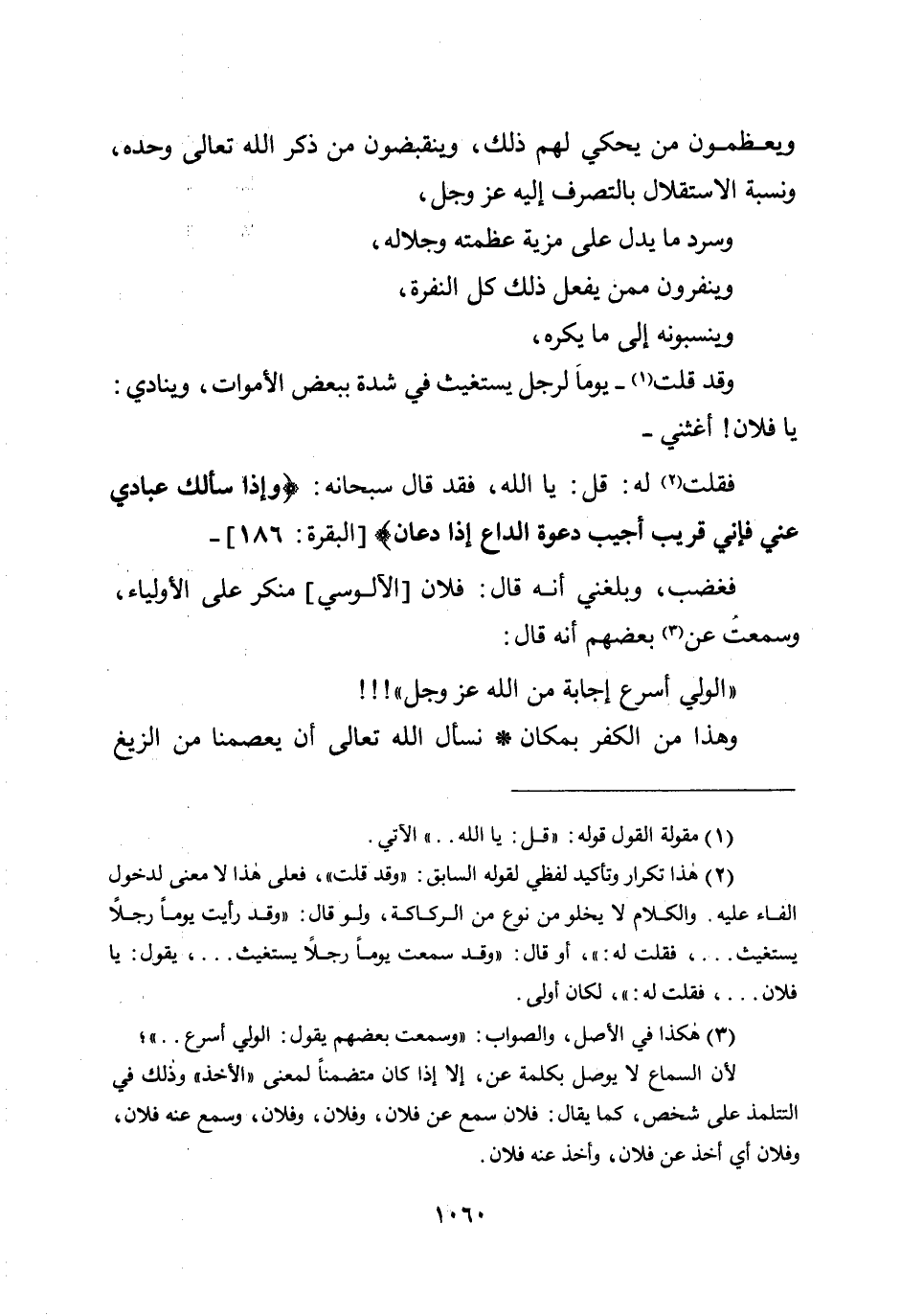 ويعظمون من يحكي لهم ذلك، وينقبضون من ذكر الله تعالى وحده، ونسبة الاستقلال بالتصرف إليه عز وجل، وسرد ما يدل على مزية عظمته وجلاله، وينفرون ممن يفعل ذلك كل النفرة، وينسبونه إلى ما يكره، وقد قلت- يوما لرجل يستغيث في شدة ببعض الأموات، وينادي: يا فلان! أغثني- فقلت: له: قل: يا الله، فقد قال سبحانه: {وَإِذَا سَأَلَكَ عِبَادِي عَنِّي فَإِنِّي قَرِيبٌ أُجِيبُ دَعْوَةَ الدَّاعِ إِذَا دَعَانِ} [البقرة: 186]- فغضب، وبلغني أنه قال: فلان [الآلوسي] منكر على الأولياء، وسمعتُ عن بعضهم أنه قال: