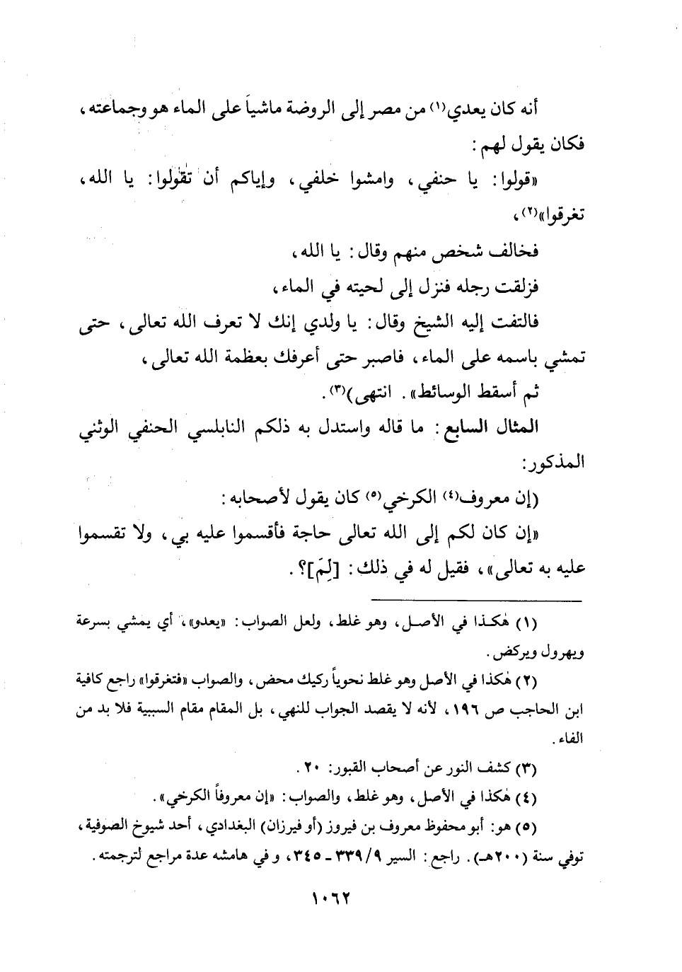 " قولوا: يا حنفي، وامشوا خلفي، وإياكم أن تقولوا: يا الله، تغرقوا "، فخالف شخص منهم وقال: يا الله، فزلقت رجله فنزل إلى لحيته في الماء، فالتفت إليه الشيخ وقال: يا ولدي إنك لا تعرف الله تعالى، حتى تمشي باسمه على الماء، فاصبر حتى أعرفك بعظمة الله تعالى، ثم أسقط الوسائط ". انتهى) .