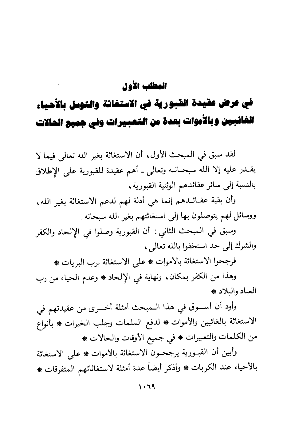 وسبق في المبحث الثاني: أن القبورية وصلوا في الإلحاد والكفر والشرك إلى حد استخفوا بالله تعالى، فرجحوا الاستغاثة بالأموات* على الاستغاثة برب البريات* وهذا من الكفر بمكان، ونهاية في الإلحاد* وعدم الحياء من رب العباد والبلاد* وأود أن أسوق في هذا المبحث أمثلة أخرى من عقيدتهم في الاستغاثة بالغائبين والأموات* لدفع الملمات وجلب الخيرات* بأنواع من الكلمات والتعبيرات * في جميع الأوقات والحالات*