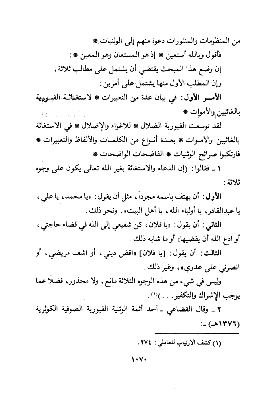 الأمر الأول: في بيان عدة من التعبيرات * لاستغاثة القبورية بالغائبين والأموات * لقد توسعت القبورية الضلال* للإغواء والإضلال * في الاستغاثة بالغائبين والأموات* بعدة أنواع من الكلمات والألفاظ والتعبيرات* فارتكبوا صرائح الوثنيات* الفاضحات الواضحات*