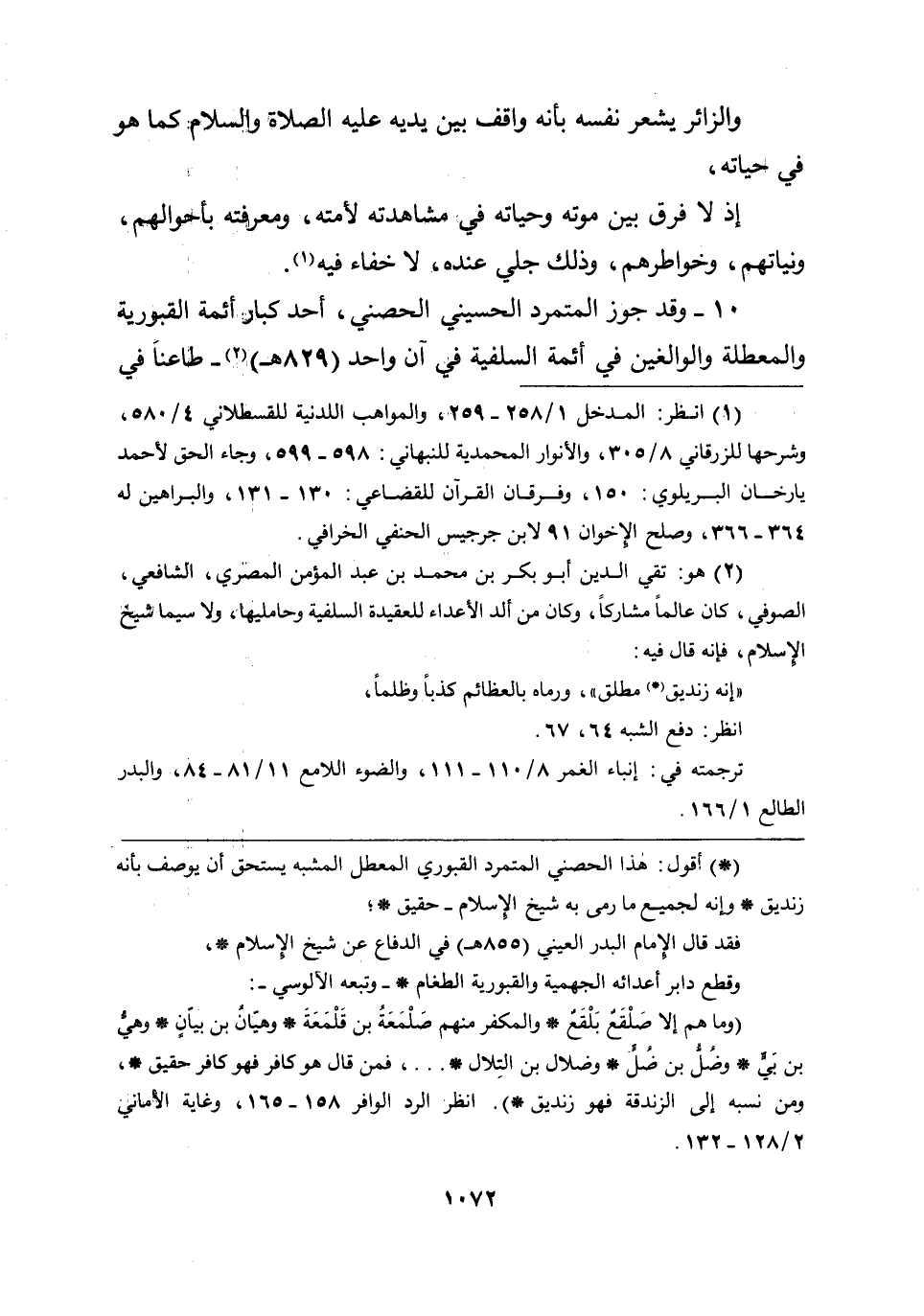 والزائر يشعر نفسه بأنه واقف بين يديه عليه الصلاة والسلام كما هو في حياته، إذ لا فرق بين موته وحياته في مشاهدته لأمته، ومعرفته بأحوالهم، ونياتهم، وخواطرهم، وذلك جلي عنده، لا خفاء فيه.