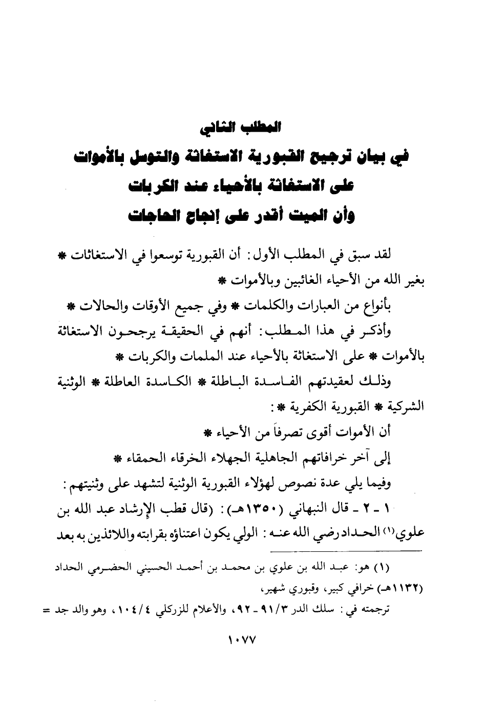 لقد سبق في المطلب الأول: أن القبورية توسعوا في الاستغاثات* بغير الله من الأحياء الغائبين وبالأموات* بأنواع من العبارات والكلمات * وفي جميع الأوقات والحالات* وأذكر في هذا المطلب: أنهم في الحقيقة يرجحون الاستغاثة بالأموات* على الاستغاثة بالأحياء عند الملمات والكربات* وذلك لعقيدتهم الفاسدة الباطلة* الكاسدة العاطلة* الوثنية الشركية* القبورية الكفرية*: