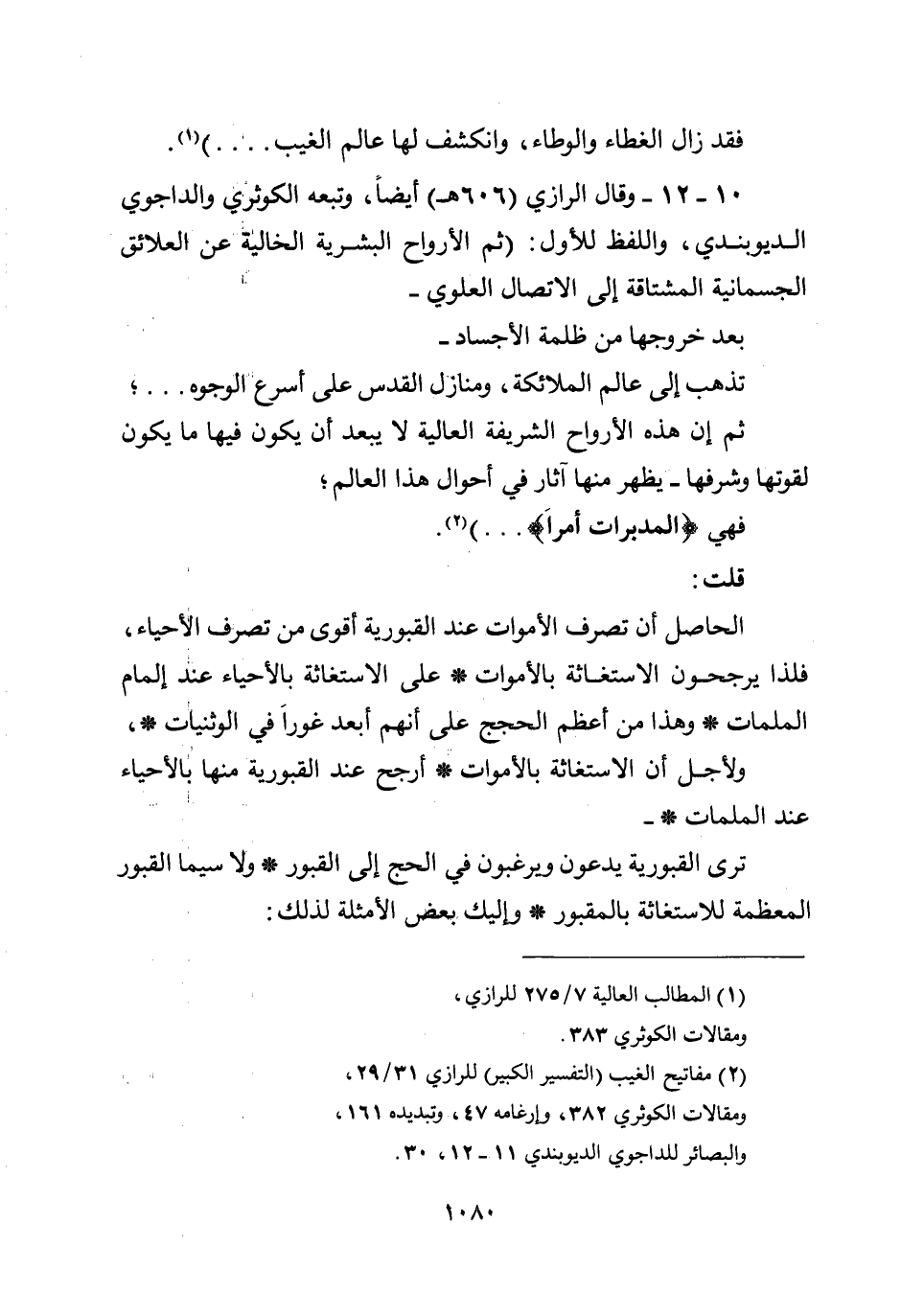 10 -12- وقال الرازي (606هـ) أيضا، وتبعه الكوثري والداجوي الديوبندي، واللفظ للأول: (ثم الأرواح البشرية الخالية عن العلائق الجسمانية المشتاقة إلى الاتصال العلوي- بعد خروجها من ظلمة الأجساد- تذهب إلى عالم الملائكة، ومنازل القدس على أسرع الوجوه ... ؛ ثم إن هذه الأرواح الشريفة العالية لا يبعد أن يكون فيها ما يكون لقوتها وشرفها- يظهر منها آثار في أحوال هذا العالم؛ فهي {فَالْمُدَبِّرَاتِ أَمْرًا} ... ) .