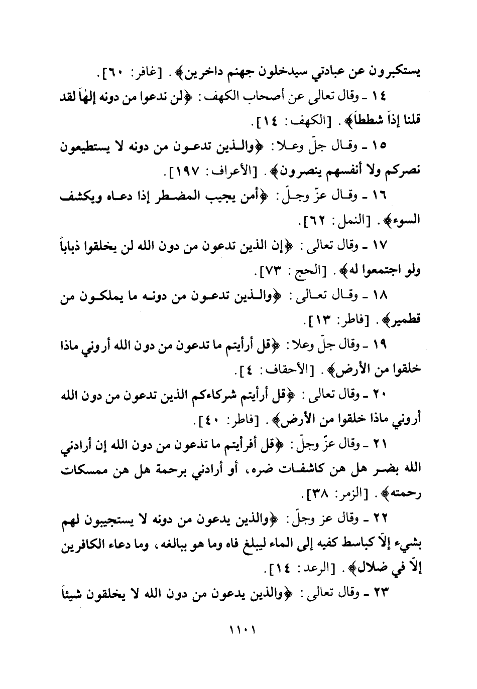 15 - وقال جل وعلا: {وَالَّذِينَ تَدْعُونَ مِنْ دُونِهِ لَا يَسْتَطِيعُونَ نَصْرَكُمْ وَلَا أَنْفُسَهُمْ يَنْصُرُونَ} [الأعراف: 197] .