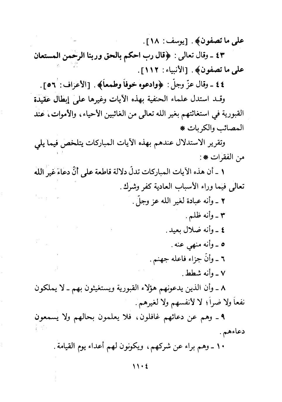 وقد استدل علماء الحنفية بهذه الآيات وغيرها على إبطال عقيدة القبورية في استغاثتهم بغير الله تعالى من الغائبين الأحياء، والأموات، عند المصائب والكربات* وتقرير الاستدلال عندهم بهذه الآيات المباركات يتلخص فيما يلي من الفقرات*: