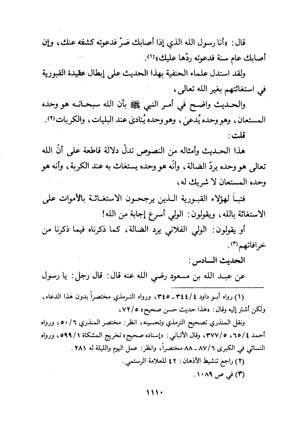 ولقد استدل علماء الحنفية بهذا الحديث على إبطال عقيدة القبورية في استغاثتهم بغير الله تعالى، والحديث واضح في أمر النبي صلى الله عليه وسلم بأن الله سبحانه هو وحده المستعان، وهو وحده يُدعى، وهو وحده يُنادى عند البليات، والكربات.