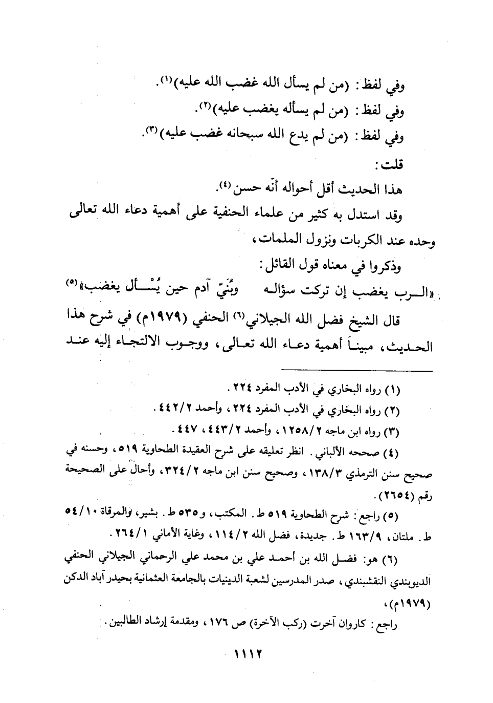 قال الشيخ فضل الله الجيلاني الحنفي (1979م) في شرح هذا الحديث، مبينا أهمية دعاء الله تعالى، ووجوب الالتجاء إليه عند