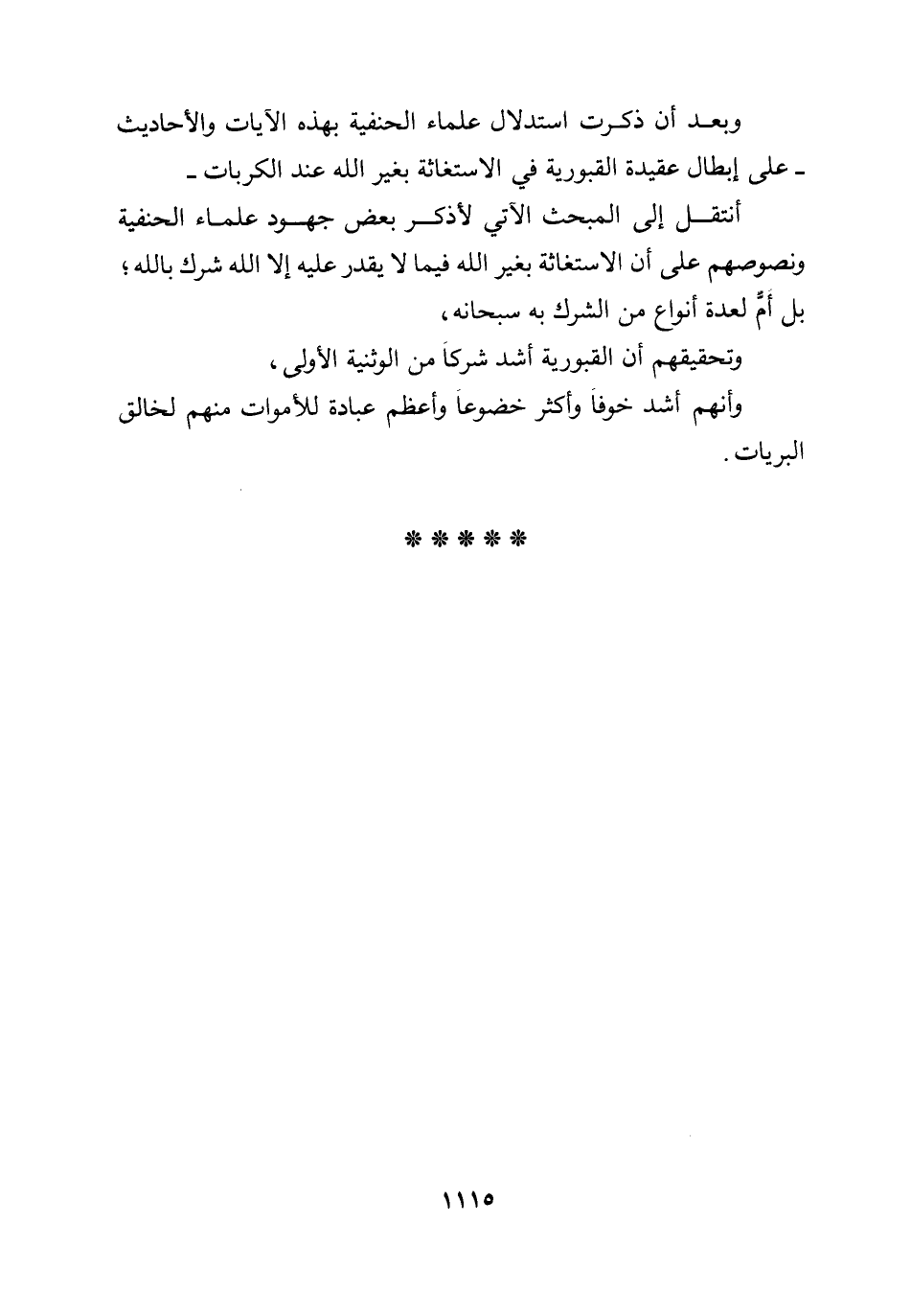 وبعد أن ذكرت استدلال علماء الحنفية بهذه الآيات والأحاديث - على إبطال عقيدة القبورية في الاستغاثة بغير الله عند الكربات- انتقل إلى المبحث الآتي لأذكر بعض جهود علماء الحنفية ونصوصهم على أن الاستغاثة بغير الله فيما لا يقدر عليه إلا الله شرك بالله؛ بل أمّ لعدة أنواع من الشرك به سبحانه، وتحقيقهم أن القبورية أشد شركا من الوثنية الأولى، وأنهم أشد خوفا وأكثر خضوعا وأعظم عبادة للأموات منهم لخالق البريات.