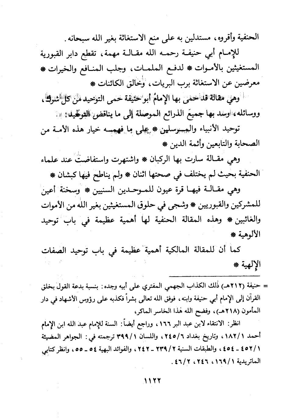 توحيد الأنبياء والمرسلين* على ما فهمه خيار هذه الأمة من الصحابة والتابعين وأئمة الدين* وهي مقالة سارت بها الركبان * واشتهرت واستفاضت عند علماء الحنفية بحيث لم يختلف في صحتها اثنان* ولم يناطح فيها كبشان* وهي مقالة فيها قرة عيون للموحدين السنيين* وسخنة أعين للمشركين والقبوريين* وشجى في حلوق المستغيثين بغير الله من الأموات والغائبين* وهذه المقالة الحنفية لها أهمية عظيمة في باب توحيد الألوهية* كما أن للمقالة المالكية أهمية عظيمة في باب توحيد الصفات الإلهية*