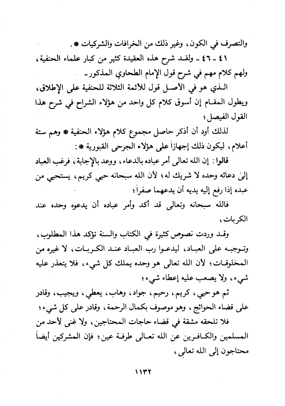 41 -46- ولقد شرح هذه العقيدة كثير من كبار علماء الحنفية، ولهم كلام مهم في شرح قول الإمام الطحاوي المذكور- الذي هو في الأصل قول للأئمة الثلاثة للحنفية على الإطلاق، ويطول المقام أن أسوق كلام كل واحد من هؤلاء الشراح في شرح هذا القول الفيصل؛ لذلك أود أن أذكر حاصل مجموع كلام هؤلاء الحنفية * وهم ستة أعلام، ليكون ذلك إجهازا على هؤلاء الجرحى القبورية *: