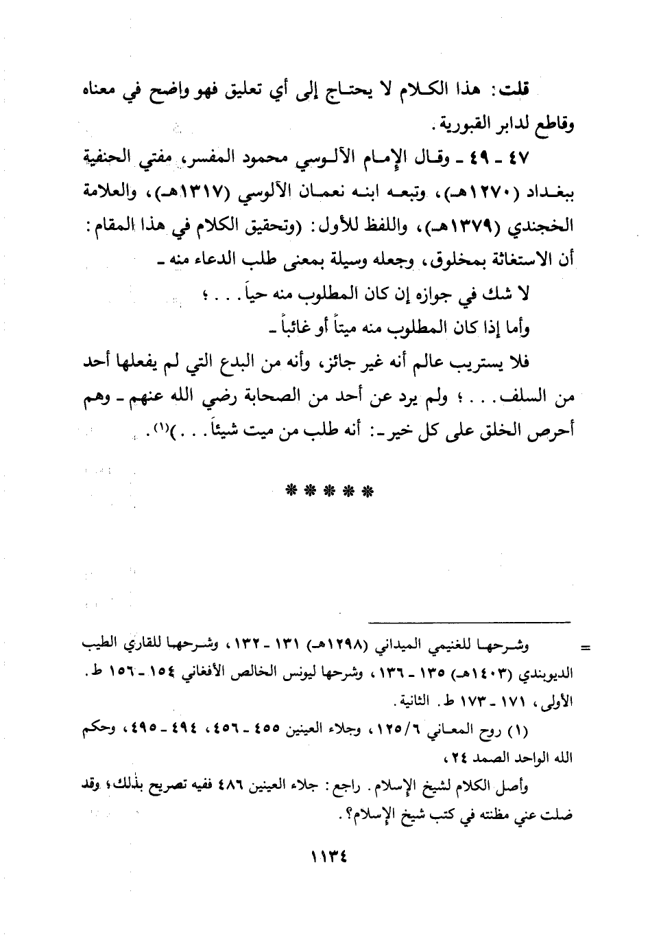 قلت: هذا الكلام لا يحتاج إلى أي تعليق فهو واضح في معناه وقاطع لدابر القبورية.