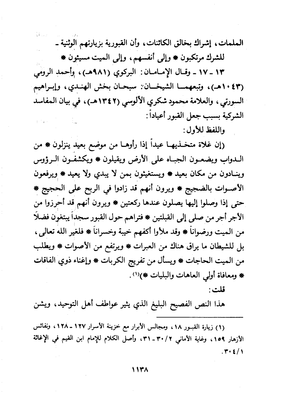 الملمات، إشراك بخالق الكائنات، وأن القبورية بزيارتهم الوثنية- للشرك مرتكبون * وإلى أنفسهم، وإلى الميت مسيئون* 13-17- وقال الإمامان: البركوي (981هـ) ، وأحمد الرومي (1043هـ) ، وتبعهما الشيخان: سبحان بخش الهندي، وإبراهيم السورتي، والعلامة محمود شكري الآلوسي (1342هـ) ، في بيان المفاسد الشركية بسبب جعل القبور أعيادا: