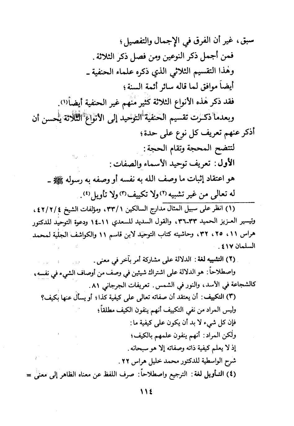 وبعدما ذكرت تقسيم الحنفية التوحيد إلى الأنواع الثلاثة يحسن أن أذكر عنهم تعريف كل نوع على حدة؛ لتتضح المحجة وتقام الحجة: