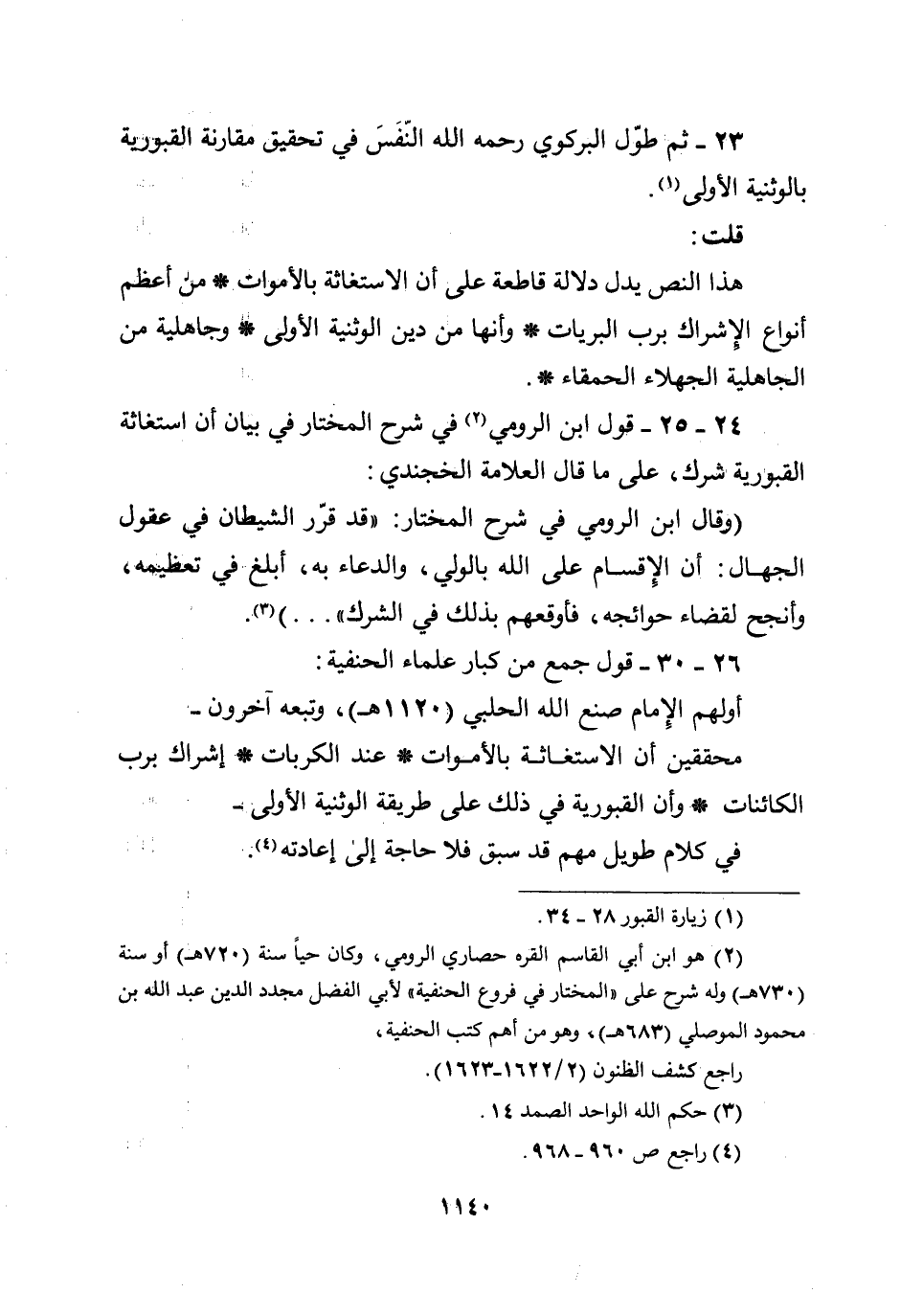 أولهم الإمام صنع الله الحلبي (1120هـ) ، وتبعه آخرون- محققين أن الاستغاثة بالأموات* عند الكربات* إشراك برب الكائنات* وأن القبورية في ذلك على طريقة الوثنية الأولى- في كلام طويل مهم قد سبق فلا حاجة إلى إعادته.