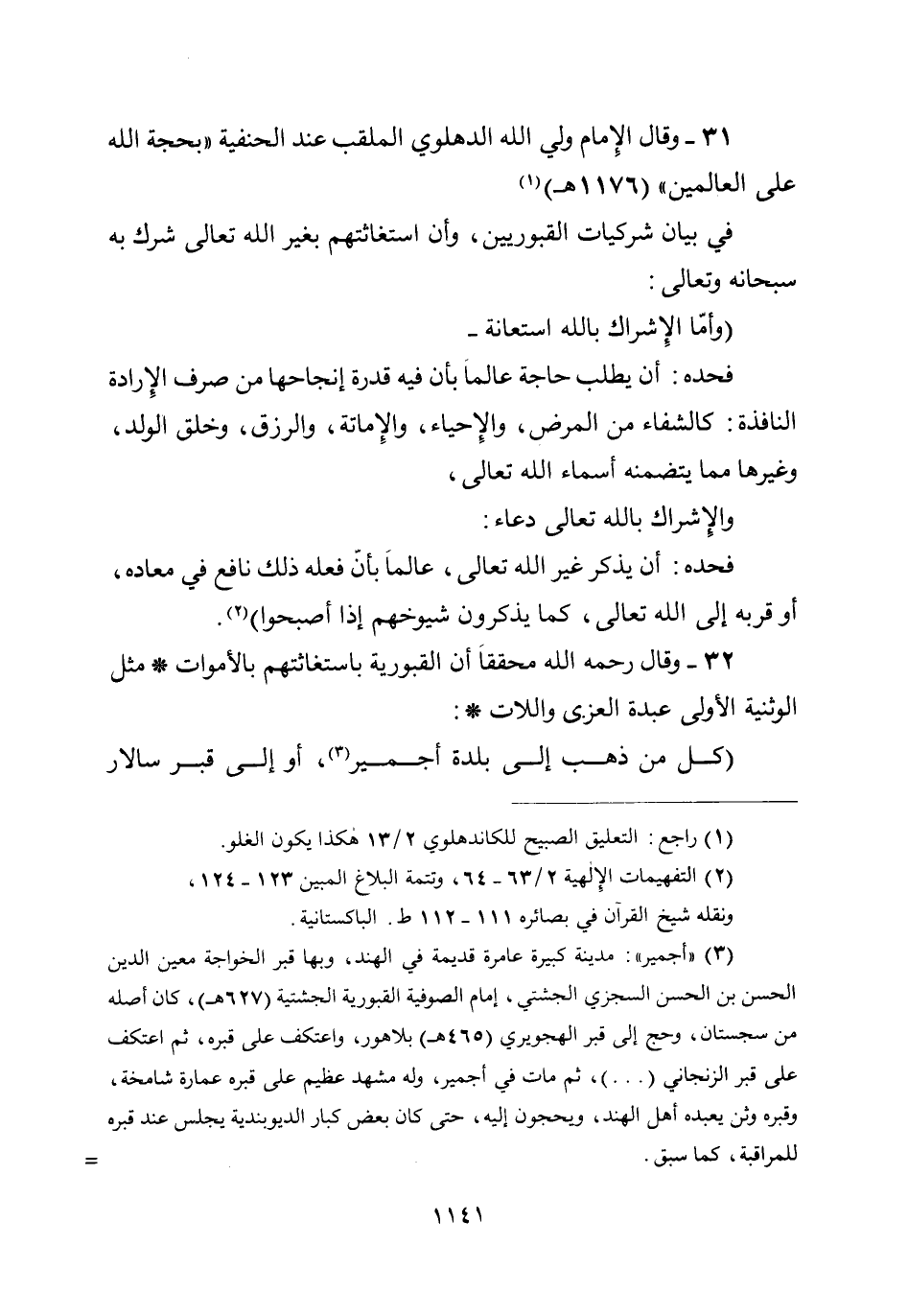 31 - وقال الإمام ولي الله الدهلوي الملقب عند الحنفية " بحجة الله على العالمين " (1176هـ) .