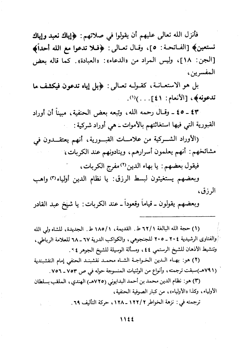 43 -45- وقال رحمه الله، وتبعه بعض الحنفية، مبينا أن أوراد القبورية التي فيها استغاثتهم بالأموات- هي أوراد شركية: