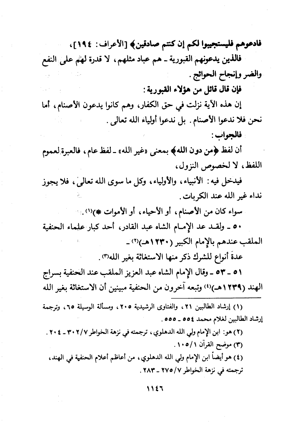 50 - ولقد عد الإمام الشاه عبد القادر، أحد كبار علماء الحنفية الملقب عندهم بالإمام الكبير (1230هـ) - عدةَ أنواع للشرك ذكر منها الاستغاثة بغير الله.
