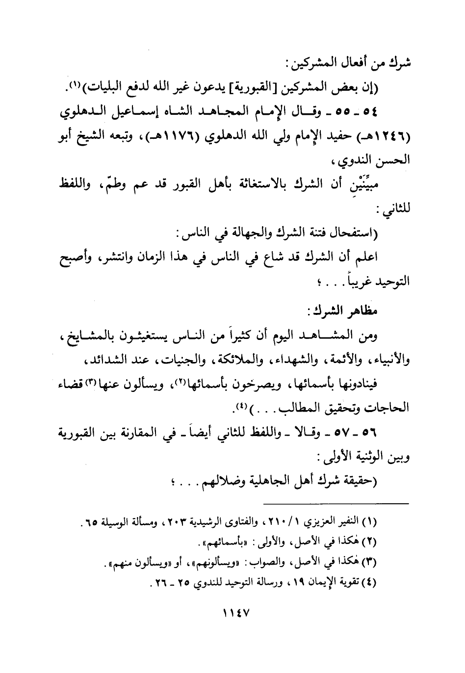 54 -55- وقال الإمام المجاهد الشاه إسماعيل الدهلوي (1246هـ) حفيد الإمام ولي الله الدهلوي (1176هـ) ، وتبعه الشيخ أبو الحسن الندوي، مبيِّنين أن الشرك بالاستغاثة بأهل القبور قد عم وطمّ، واللفظ للثاني: