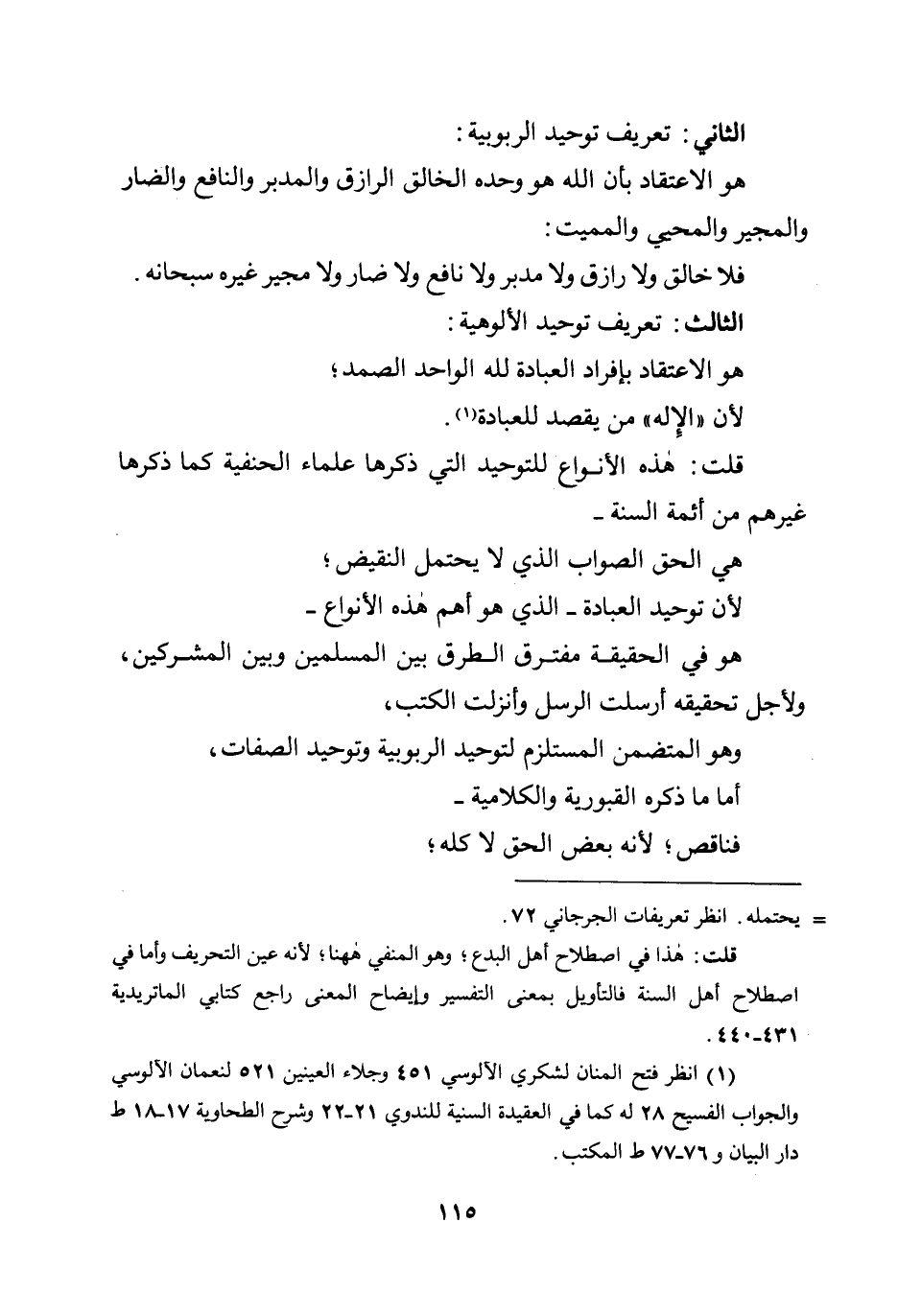 قلت: هذه الأنواع للتوحيد التي ذكرها علماء الحنفية كما ذكرها غيرهم من أئمة السنة - هي الحق الصواب الذي لا يحتمل النقيض؛ لأن توحيد العبادة - الذي هو أهم هذه الأنواع - هو في الحقيقة مفترق الطرق بين المسلمين وبين المشركين، ولأجل تحقيقه أرسلت الرسل وأنزلت الكتب، وهو المتضمن المستلزم لتوحيد الربوبية وتوحيد الصفات، أما ما ذكره القبورية والكلامية - فناقص؛ لأنه بعض الحق لا كله؛