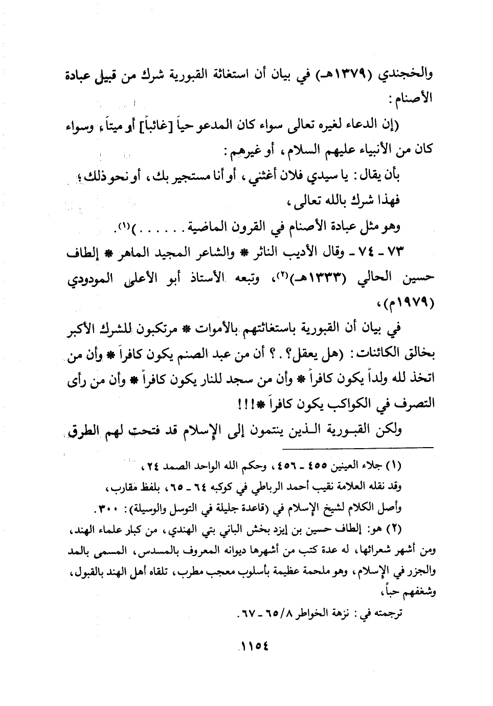 73 -74- وقال الأديب الناثر* والشاعر المجيد الماهر* إلطاف حسين الحالي (1333هـ) ، وتبعه الأستاذ أبو الأعلى المودودي (1979م) ، في بيان أن القبورية باستغاثتهم بالأموات* مرتكبون للشرك الأكبر بخالق الكائنات: (هل يعقل؟.؟ أن من عبد الصنم يكون كافرا* وأن من اتخذ لله ولدا يكون كافرا* وأن من سجد للنار يكون كافرا* وأن من رأى التصرف في الكواكب يكون كافرا*!!! ولكن القبورية الذين ينتمون إلى الإسلام قد فتحت لهم الطرق