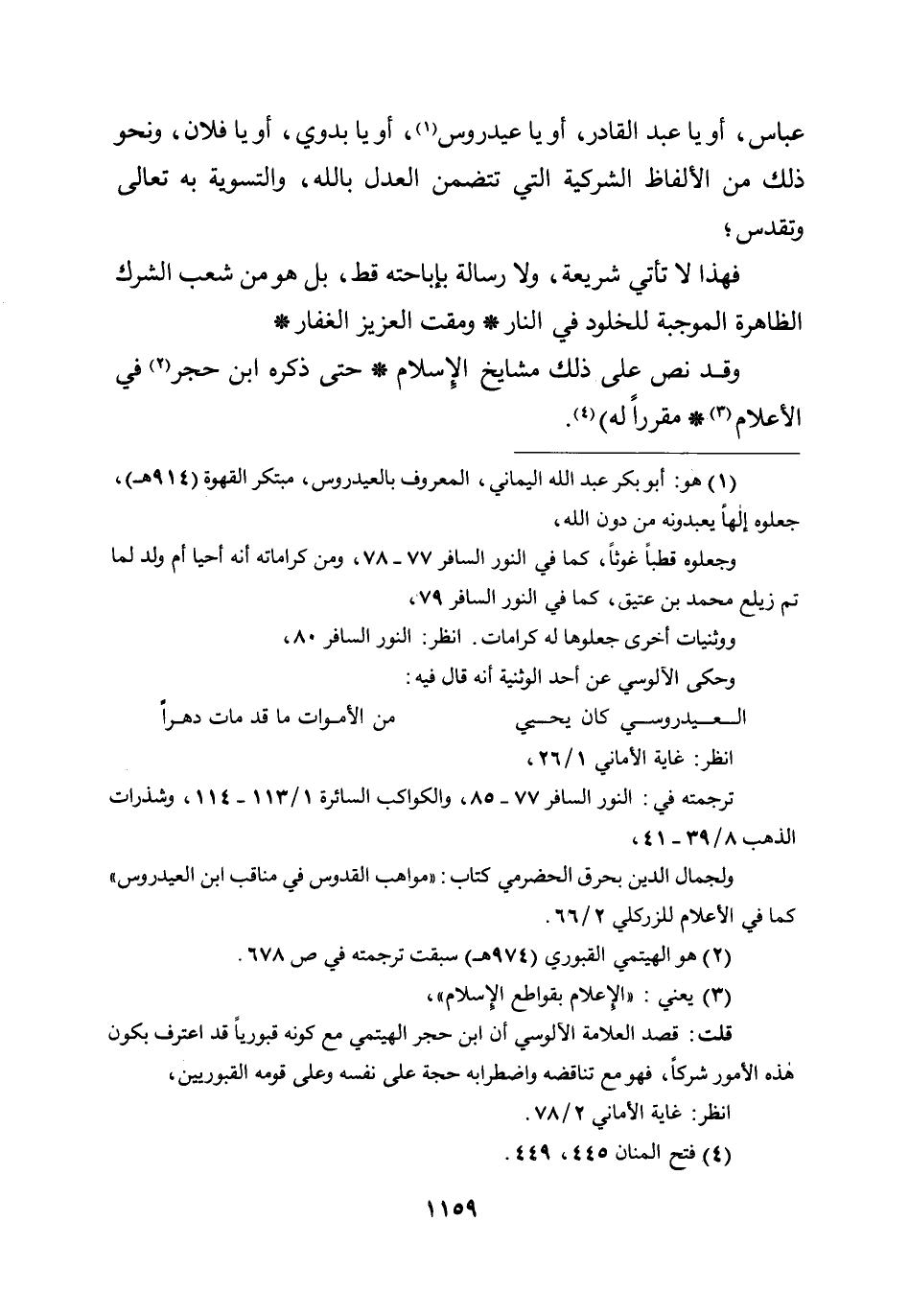 عباس، أو يا عبد القادر، أو يا عيدروس، أو يا بدوي، أو يا فلان، ونحو ذلك من الألفاظ الشركية التي تتضمن العدل بالله، والتسوية به تعالى وتقدس؛ فهذا لا تأتي شريعة، ولا رسالة بإباحته قط، بل هو من شعب الشرك الظاهرة الموجبة للخلود في النار* ومقت العزيز الغفار* وقد نص على ذلك مشايخ الإسلام* حتى ذكره ابن حجر في الأعلام * مقررا له) .