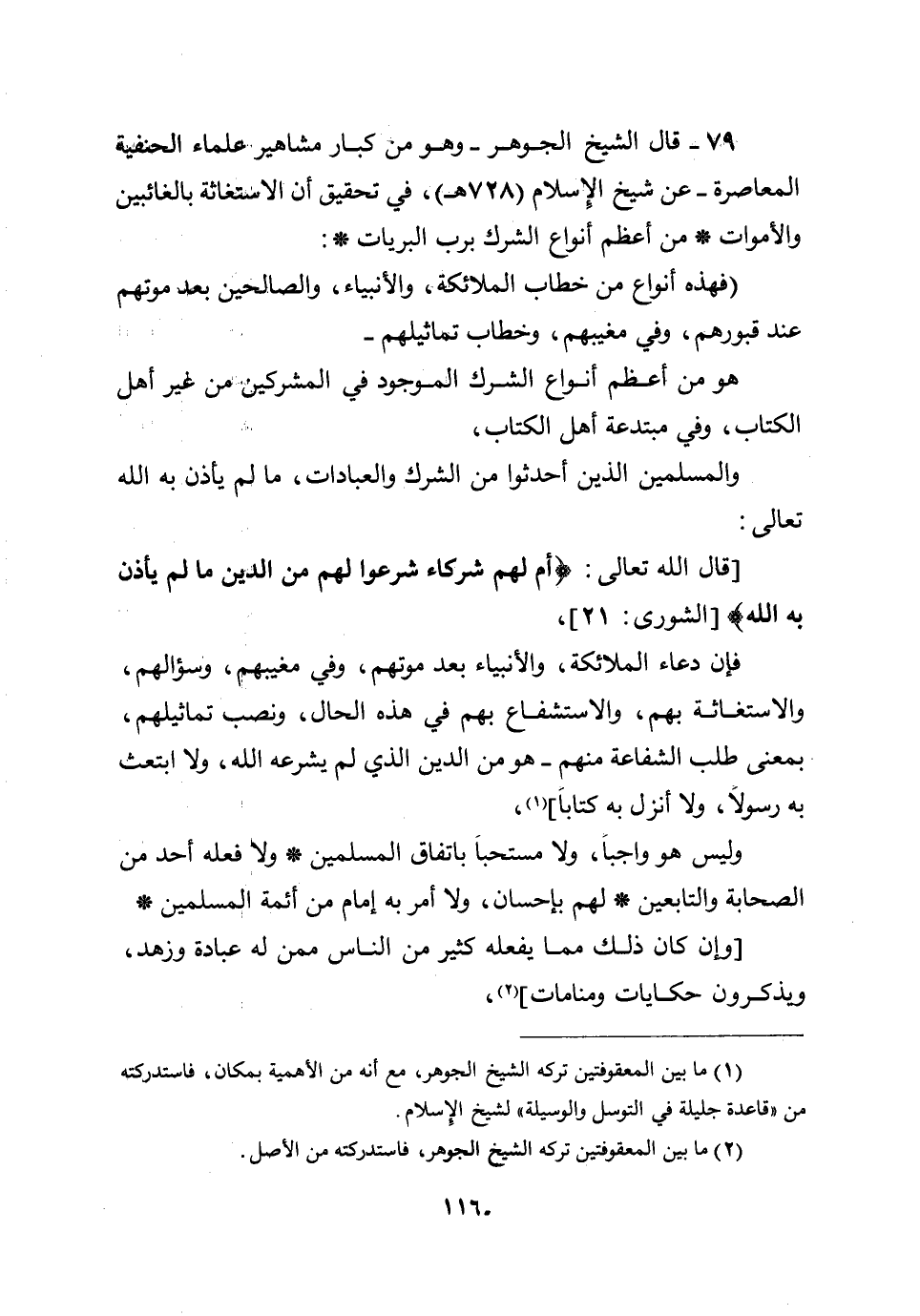 79 - قال الشيخ الجوهر - وهو من كبار مشاهير علماء الحنفية المعاصرة- عن شيخ الإسلام (728هـ) ، في تحقيق أن الاستغاثة بالغائبين والأموات* من أعظم أنواع الشرك برب البريات*: