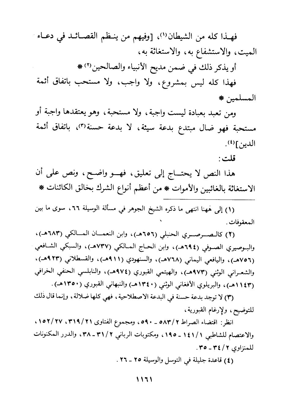 قلت: هذا النص لا يحتاج إلى تعليق، فهو واضح، ونص على أن الاستغاثة بالغائبين والأموات * من أعظم أنواع الشرك بخالق الكائنات*