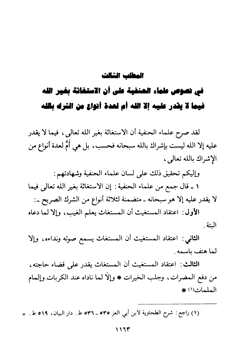 1 - قال جمع من علماء الحنفية: إن الاستغاثة بغير الله تعالى فيما لا يقدر عليه إلا هو سبحانه - متضمنة لثلاثة أنواع من الشرك الصريح-: