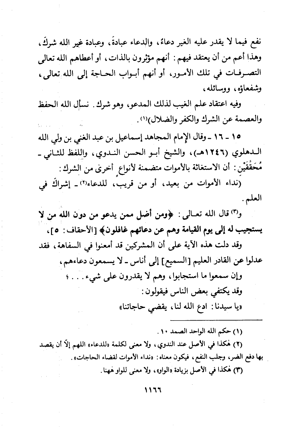 15 -16- وقال الإمام المجاهد إسماعيل بن عبد الغني بن ولي الله الدهلوي (1246هـ) ، والشيخ أبو الحسن الندوي، واللفظ للثاني- مُحَقّقين: أن الاستغاثة بالأموات متضمنة لأنواعٍ أخرى من الشرك: