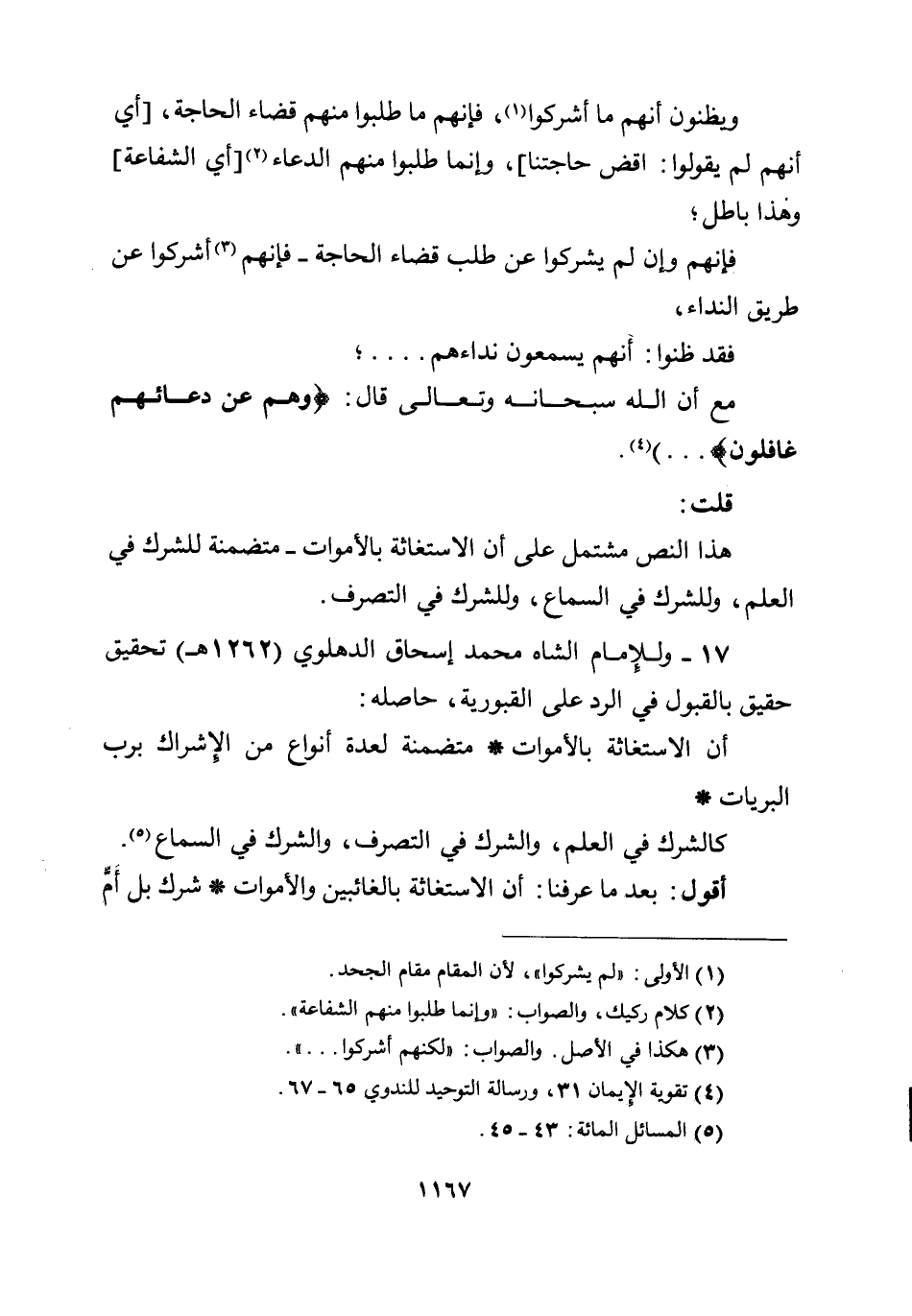 قلت: هذا النص مشتمل على أن الاستغاثة بالأموات- متضمنة للشرك في العلم، وللشرك في السماع، وللشرك في التصرف.