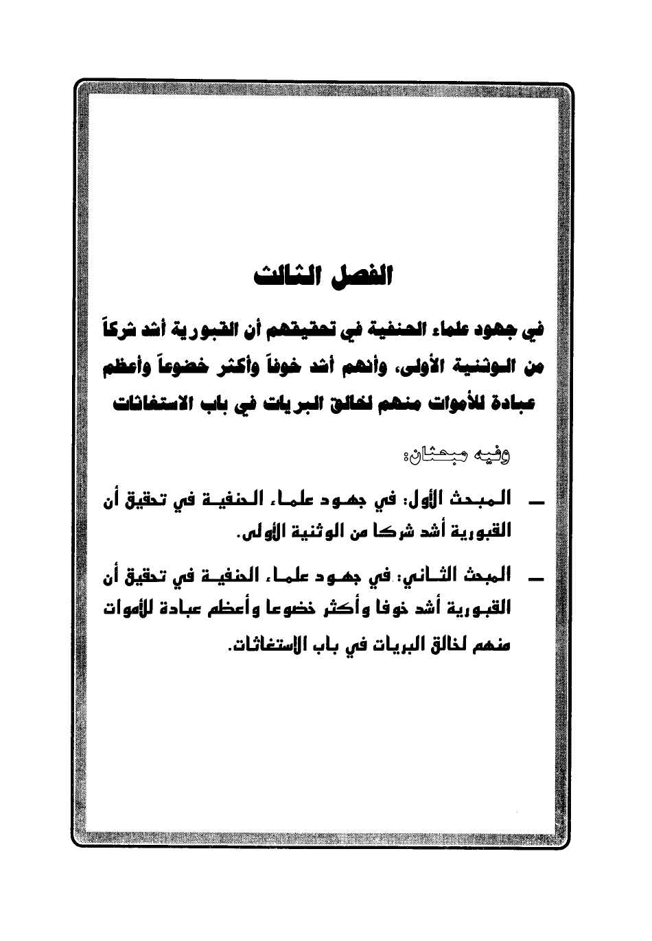 - المبحث الثاني: في جهود علماء الحنفية في تحقيق أن القبورية أشد خوفا وأكثر خضوعا وأعظم عبادة للأموات منهم لخالق البريات في باب الاستغاثات.