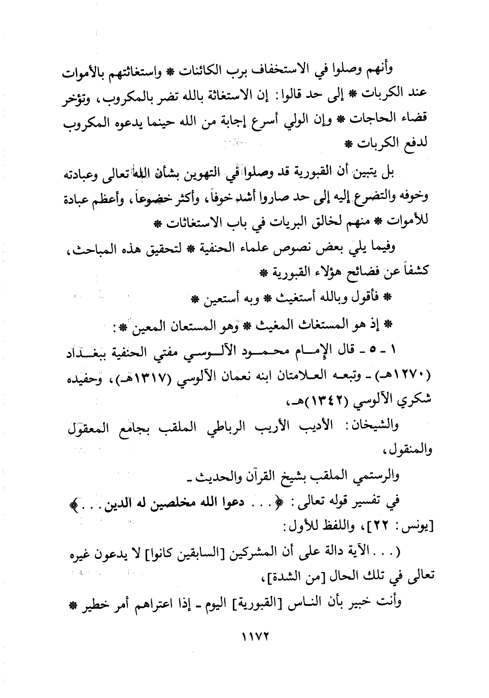 1 -5- قال الإمام محمود الآلوسي مفتي الحنفية ببغداد (1270هـ) - وتبعه العلامتان ابنه نعمان الآلوسي (1317هـ) ، وحفيده شكري الآلوسي (1342هـ) ، والشيخان: الأديب الأريب الرباطي الملقب بجامع المعقول والمنقول، والرستمي الملقب بشيخ القرآن والحديث- في تفسير قوله تعالى:.... {دَعَوُا اللَّهَ مُخْلِصِينَ لَهُ الدِّينَ} ... [يونس: 22] ، واللفظ للأول: