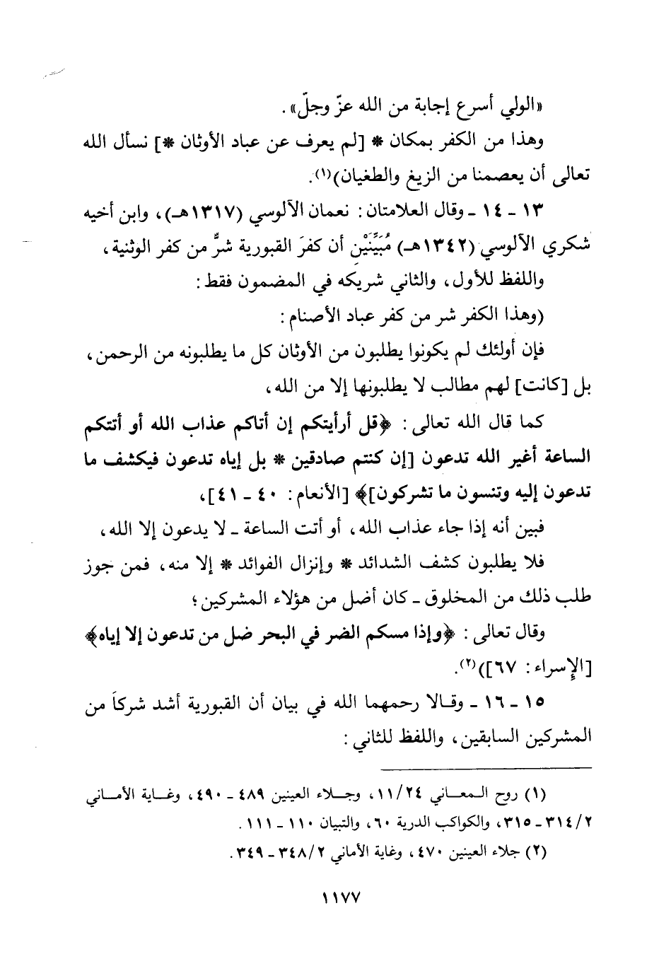 13 -14- وقال العلامتان: نعمان الآلوسي (1317هـ) ، وابن أخيه شكري الآلوسي (1342هـ) مُبَيِّنين أن كفرَ القبورية شر من كفر الوثنية، واللفظ للأول، والثاني شريكه في المضمون فقط: