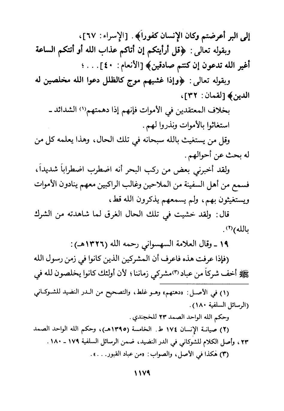 ولقد أخبرني بعض من ركب البحر أنه اضطرب اضطرابا شديدا، فسمع من أهل السفينة من الملاحين وغالب الراكبين معهم ينادون الأموات ويستغيثون بهم، ولم يسمعهم يذكرون الله قط، قال: ولقد خشيت في تلك الحال الغرق لما شاهدته من الشرك بالله) .