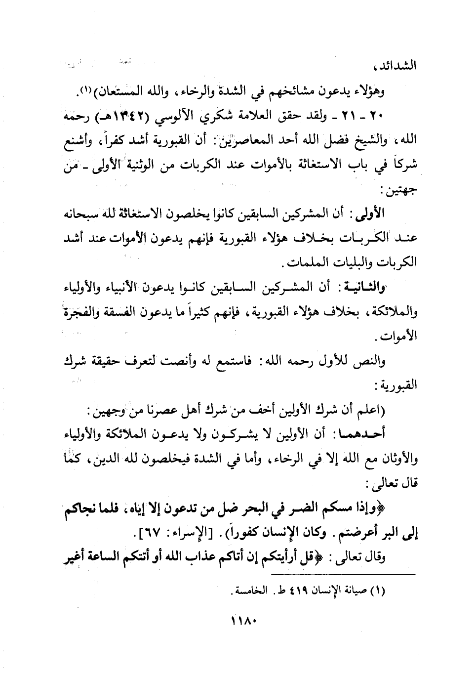 20 -21- ولقد حقق العلامة شكري الآلوسي (1342هـ) رحمه الله، والشيخ فضل الله أحد المعاصرين: أن القبورية أشد كفرا، واشنع شركا في باب الاستغاثة بالأموات عند الكربات من الوثنية الأولى - من جهتين: