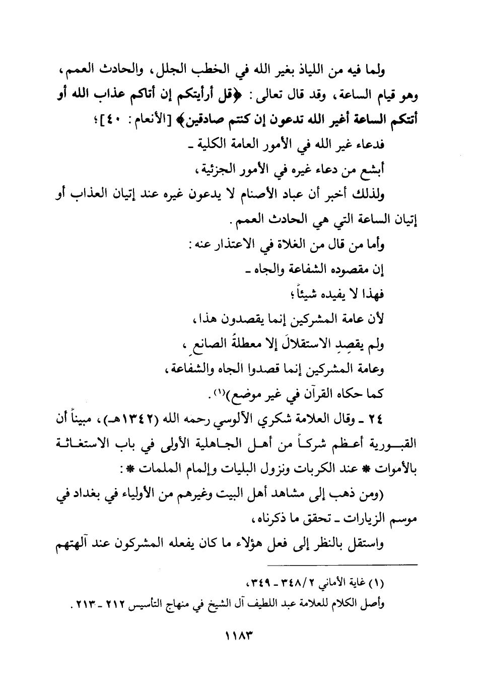 24 - وقال العلامة شكري الآلوسي رحمه الله (1342هـ) ، مبينا أن القبورية أعظم شركا من أهل الجاهلية الأولى في باب الاستغاثة بالأموات* عند الكربات ونزول البليات وإلمام الملمات*: