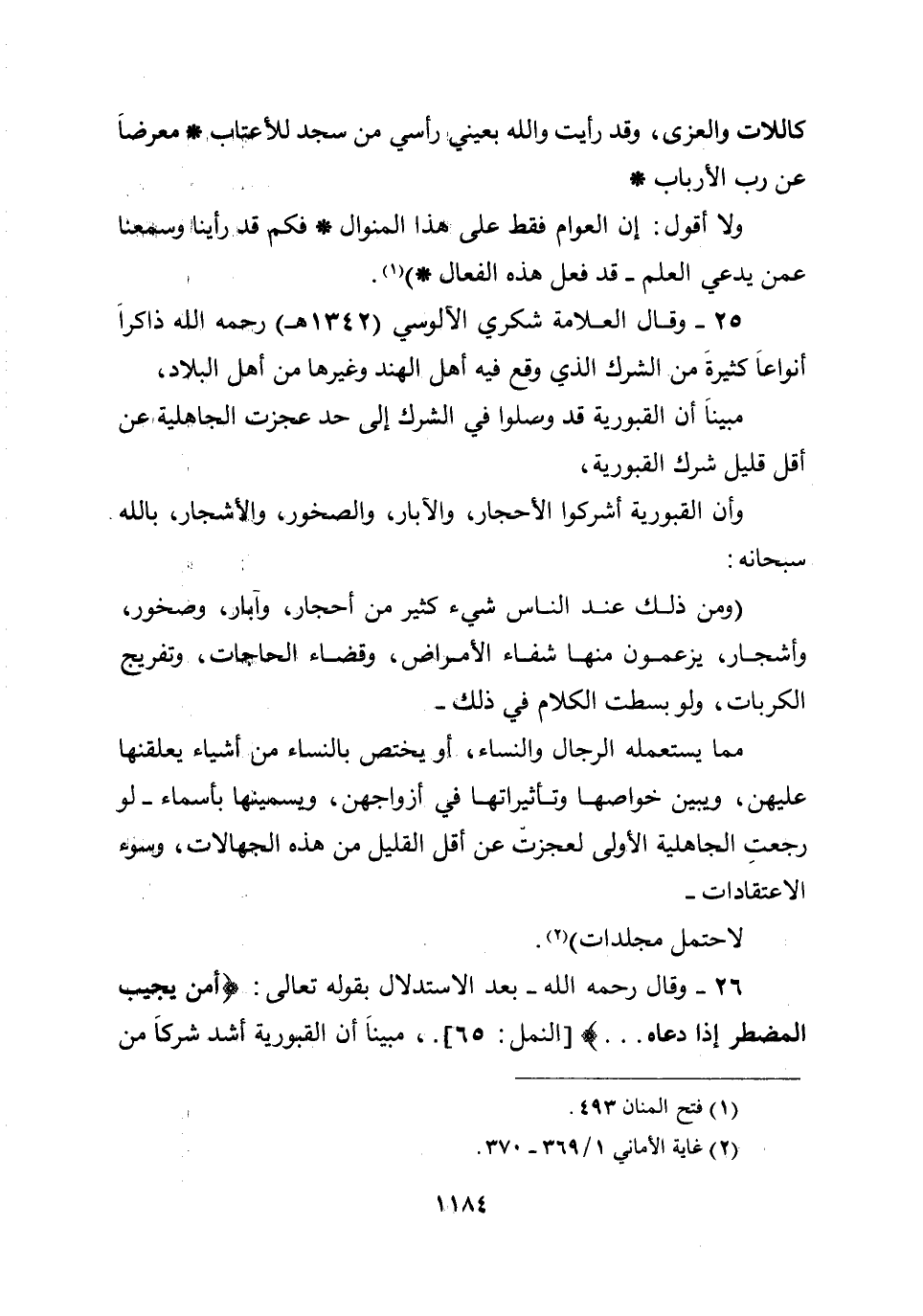 25 - وقال العلامة شكري الآلوسي (1342هـ) رحمه الله ذاكرا أنواعا كثيرة من الشرك الذي وقع فيه أهل الهند وغيرها من أهل البلاد، مبينا أن القبورية قد وصلوا في الشرك إلى حد عجزت الجاهلية عن أقل قليل شرك القبورية، وأن القبورية أشركوا الأحجار، والآبار، والصخور، والأشجار، بالله سبحانه: