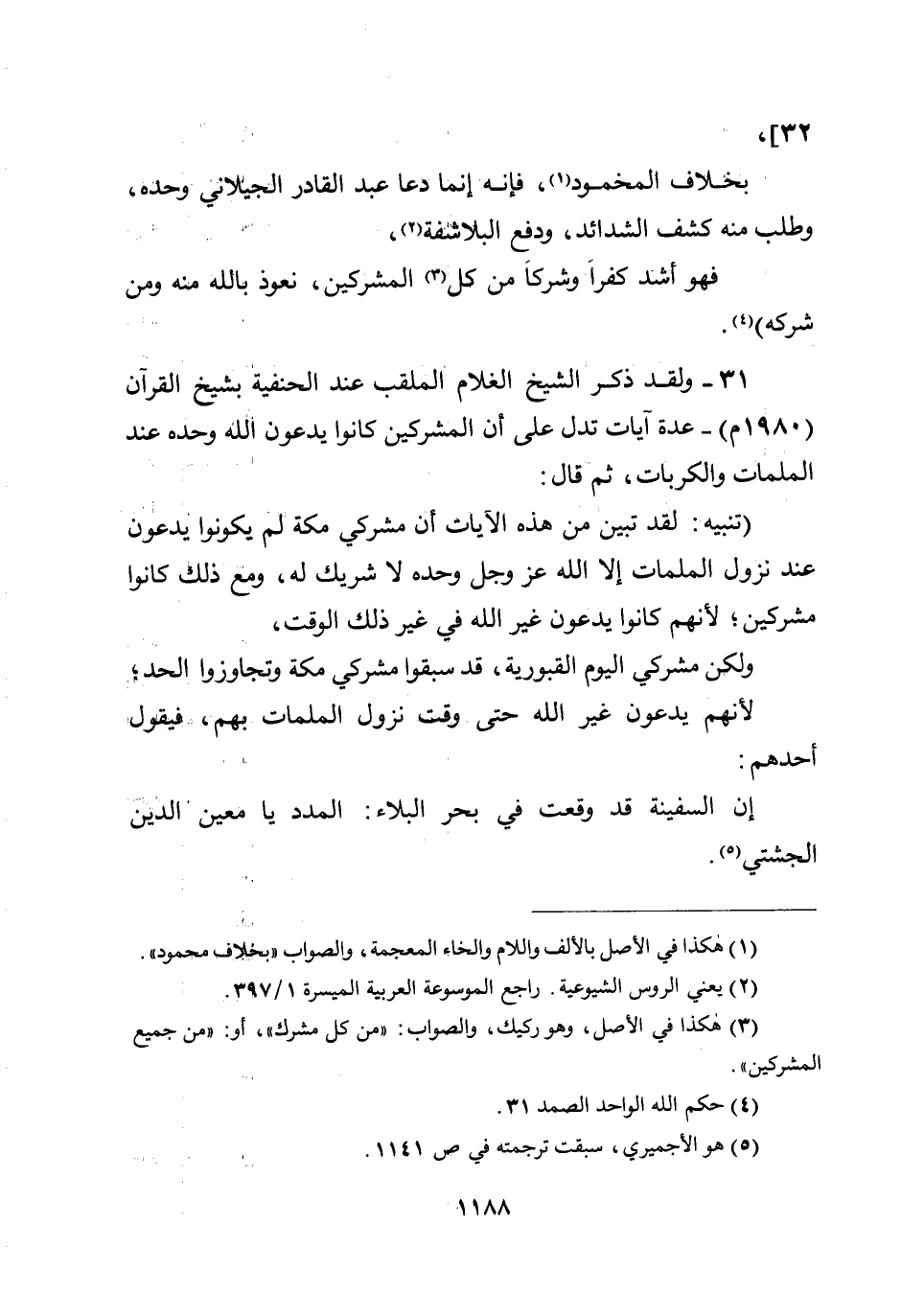 32] ، بخلاف المخمود، فإنه إنما دعا عبد القادر الجيلاني وحده، وطلب منه كشف الشدائد، ودفع البلاشفة، فهو أشد كفرا وشركا من كل المشركين، نعوذ بالله منه ومن شركه) .