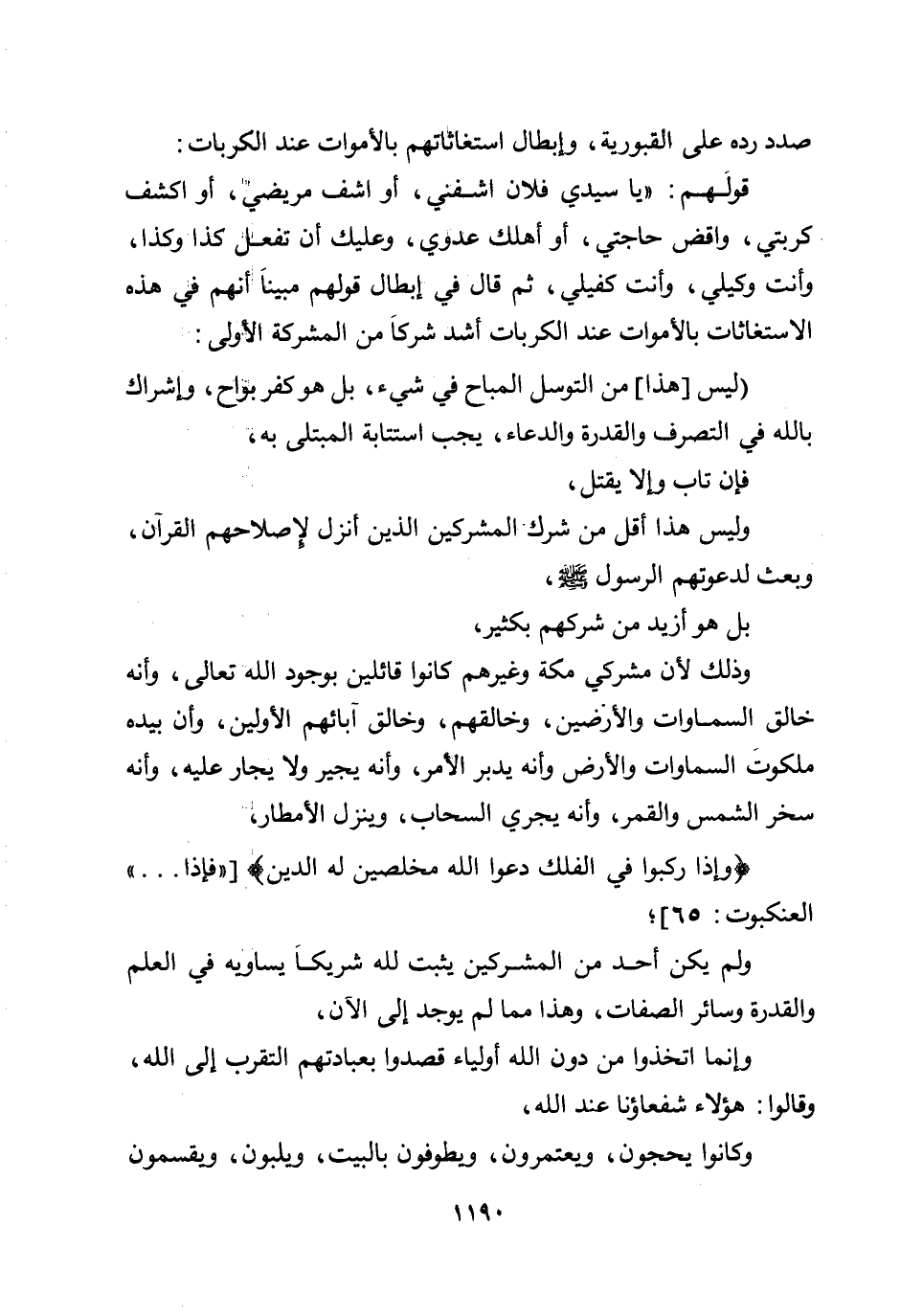 قولهم: " يا سيدي فلان اشفني، أو اشف مريضي، أو اكشف كربتي، واقض حاجتي، أو أهلك عدوي، وعليك أن تفعل كذا وكذا، وأنت وكيلي، وأنت كفيلي، ثم قال في إبطال قولهم مبينا أنهم في هذه الاستغاثات بالأموات عند الكربات أشد شركا من المشركة الأولى:
