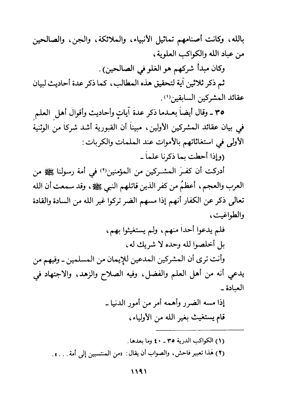 35 - وقال أيضا بعدما ذكر عدة آياتٍ وأحاديث وأقوال أهلِ العلمِ في بيان عقائد المشركين الأولين، مبينا أن القبورية أشد شركا من الوثنية الأولى في استغاثاتهم بالأموات عند الملمات والكربات: