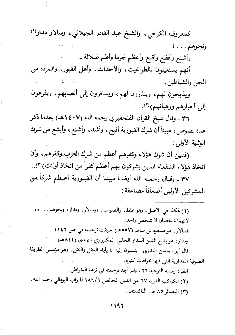 كمعروف الكرخي والشيخ عبد القادر الجيلاني، وسالار مدار ونحوهم ... ؛ وأشنع وأفظع وأقبح وأعظم جرما وأطم ضلالة- أنهم يستغيثون بالطواغيت، والأجداث، وأهل القبور، والمردة من الجن والشياطين، ويذبحون لهم، وينذرون لهم، ويسافرون إلى أنصابهم، ويفزعون إلى أحبارهم ورهبانهم) .