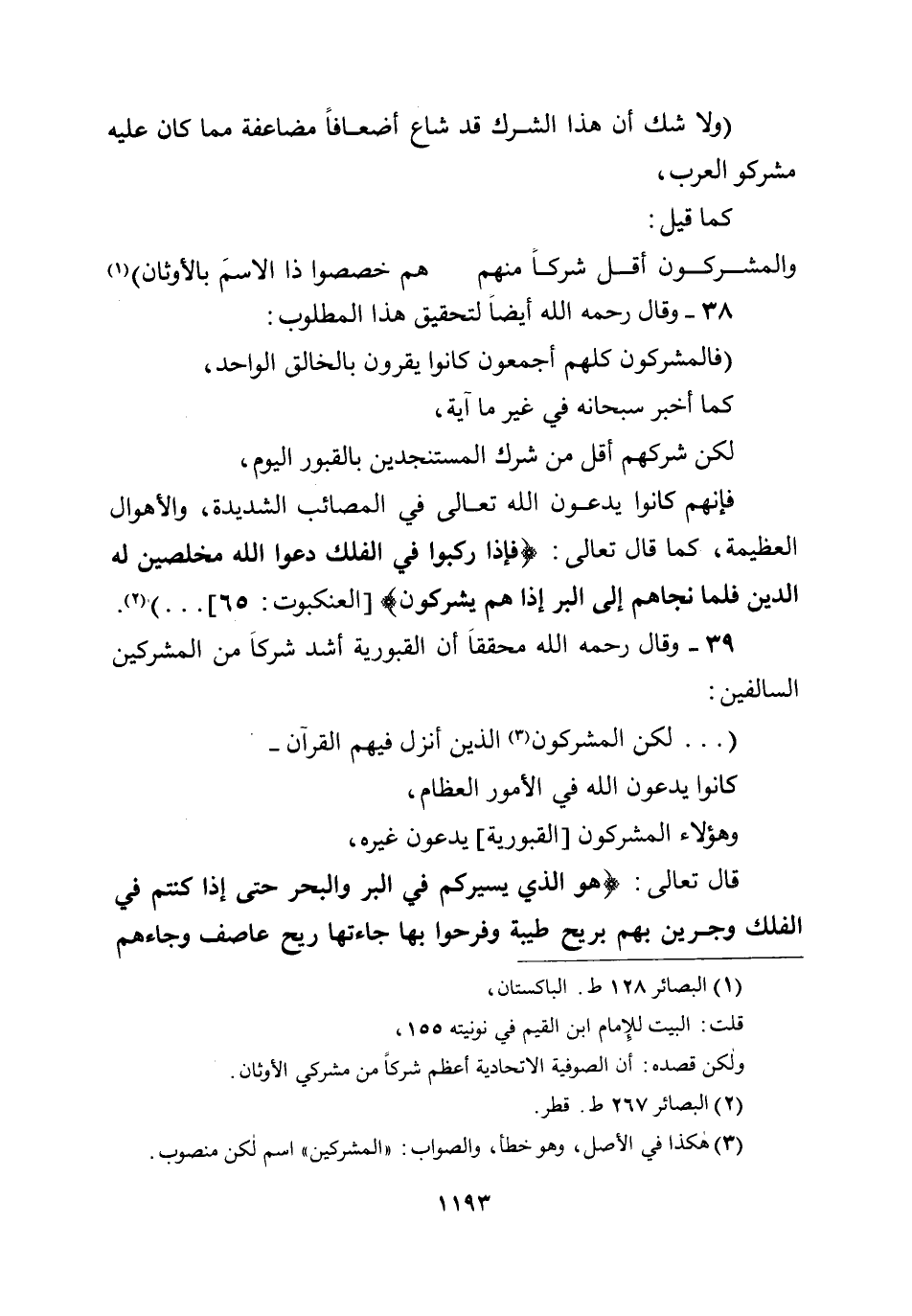 (....لكن المشركون الذين أنزل فيهم القرآن- كانوا يدعون الله في الأمور العظام، وهؤلاء المشركون [القبورية] يدعون غيره، قال تعالى: {هُوَ الَّذِي يُسَيِّرُكُمْ فِي الْبَرِّ وَالْبَحْرِ حَتَّى إِذَا كُنْتُمْ فِي الْفُلْكِ وَجَرَيْنَ بِهِمْ بِرِيحٍ طَيِّبَةٍ وَفَرِحُوا بِهَا جَاءَتْهَا رِيحٌ عَاصِفٌ وَجَاءَهُمُ الْمَوْجُ مِنْ كُلِّ مَكَانٍ وَظَنُّوا أَنَّهُمْ أُحِيطَ بِهِمْ دَعَوُا اللَّهَ مُخْلِصِينَ لَهُ الدِّينَ لَئِنْ أَنْجَيْتَنَا مِنْ هَذِهِ لَنَكُونَنَّ مِنَ الشَّاكِرِينَ}