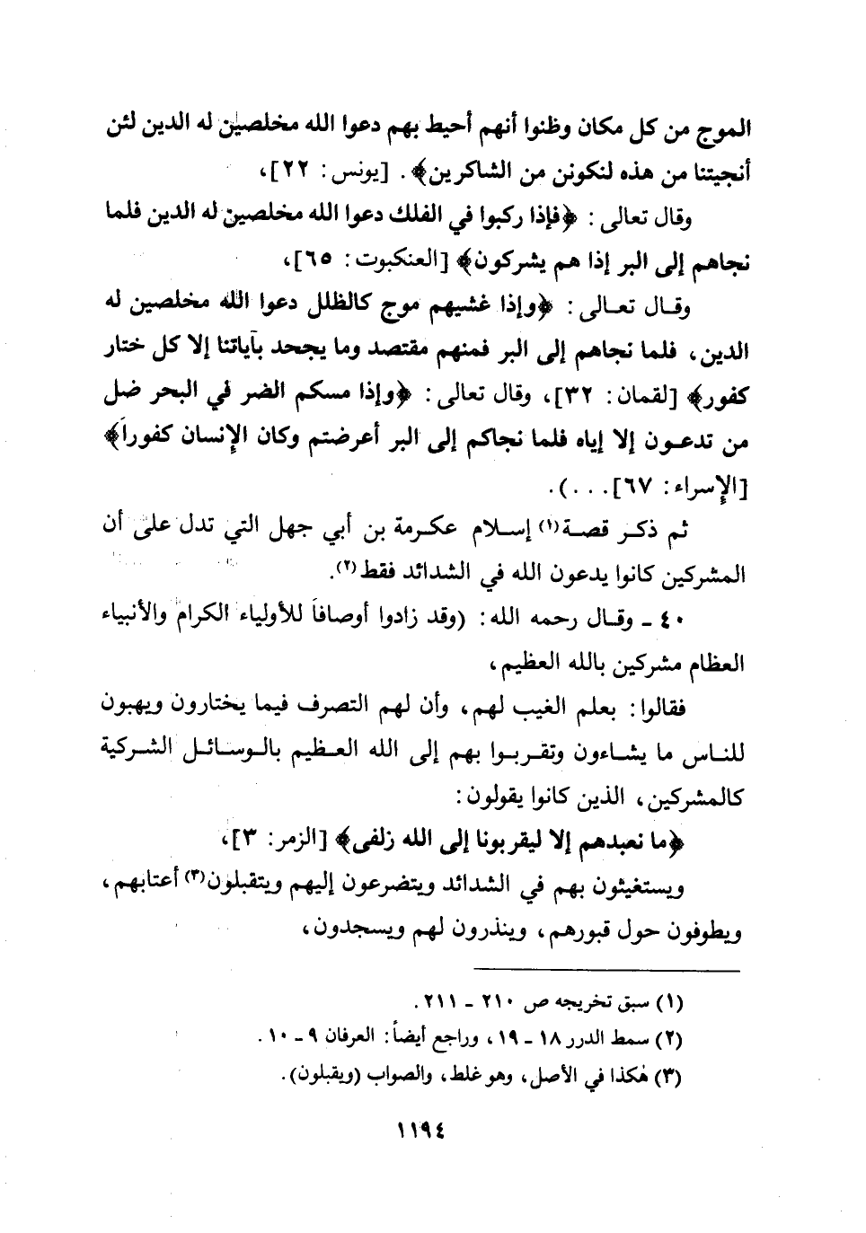 [يونس: 22] ، وقال تعالى: {فَإِذَا رَكِبُوا فِي الْفُلْكِ دَعَوُا اللَّهَ مُخْلِصِينَ لَهُ الدِّينَ فَلَمَّا نَجَّاهُمْ إِلَى الْبَرِّ إِذَا هُمْ يُشْرِكُونَ} [العنكبوت: 65] ، وقال تعالى: {وَإِذَا غَشِيَهُمْ مَوْجٌ كَالظُّلَلِ دَعَوُا اللَّهَ مُخْلِصِينَ لَهُ الدِّينَ فَلَمَّا نَجَّاهُمْ إِلَى الْبَرِّ فَمِنْهُمْ مُقْتَصِدٌ وَمَا يَجْحَدُ بِآيَاتِنَا إِلَّا كُلُّ خَتَّارٍ كَفُورٍ} [لقمان: 32] ، وقال تعالى: {وَإِذَا مَسَّكُمُ الضُّرُّ فِي الْبَحْرِ ضَلَّ مَنْ تَدْعُونَ إِلَّا إِيَّاهُ فَلَمَّا نَجَّاكُمْ إِلَى الْبَرِّ أَعْرَضْتُمْ وَكَانَ الْإِنْسَانُ كَفُورًا} [الإسراء: 67] ... ) .