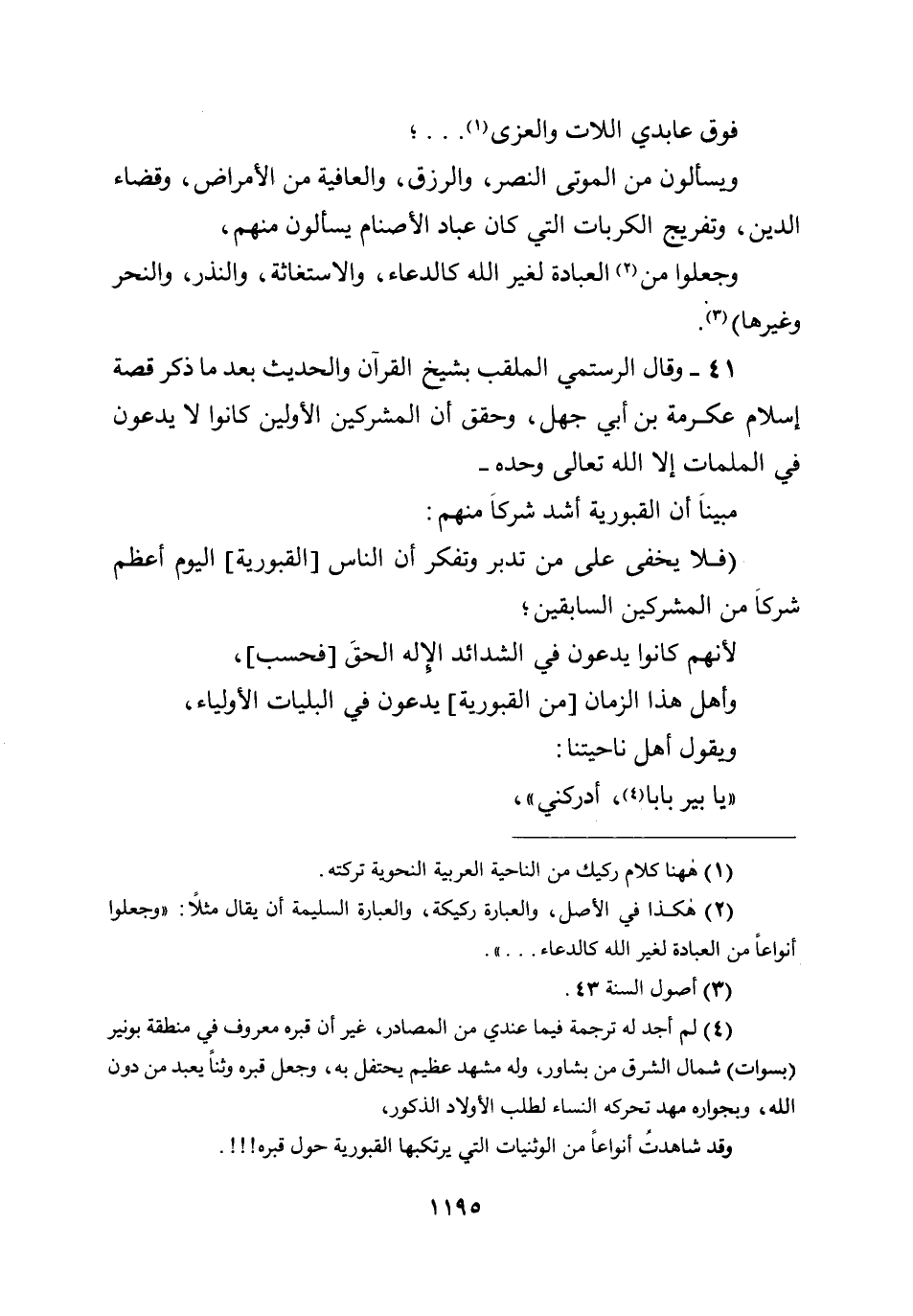 فوق عابدي اللات والعزى ... ؛ ويسألون من الموتى النصر، والرزق، والعافية من الأمراض، وقضاء الدين، وتفريج الكربات التي كان عباد الأصنام يسألون منهم، وجعلوا من العبادة غير الله كالدعاء، والاستغاثة، والنذر، والنحر وغيرها) .