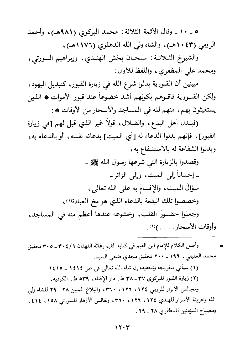 5 -10- وقال الأئمة الثلاثة: محمد البركوي (981هـ) ، وأحمد الرومي (1043هـ) ، والشاه ولي الله الدهلوي (1176هـ) ، والشيوخ الثلاثة: سبحان بخش الهندي، وإبراهيم السورتي، ومحمد علي المظفري، والفظ للأول: