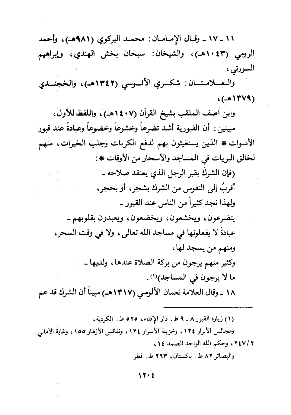 11 -17- وقال الإمامان: محمد البركوي (981هـ) ، وأحمد الرومي (1043هـ) ، والشيخان: سبحان بخش الهندي، وإبراهيم السورتي، والعلامتان: شكري الآلوسي (1342هـ) ، والخجندي (1379هـ) ، وابن آصف الملقب بشيخ القرآن (1407هـ) ، واللفظ للأول، مبينين: أن القبورية أشد تضرعا وخشوعا وخضوعا وعبادةً عند قبور الأموات* الذين يستغيثون بهم لدفع الكربات وجلب الخيرات، منهم لخالق البريات في المساجد والأسحار من الأوقات*:
