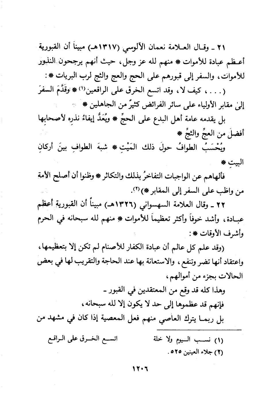 ... ، كيف لا، وقد اتسع الخرق على الراقعين* وقدّمَ السفر إلى مقابر الأولياء على سائر الفرائض كثيرٌ من الجاهلين* بل يقدمه عامة أهل البدع على الحجّ* ويُعد إيفاءُ نذرِه لأصحابها أفضل من العج والثجّ* ويُحسب الطواف حول ذلك الميتِ * شبهَ الطوافِ بينَ أركانِ البيتِ* فألهاهم عن الواجبات التفاخرُ بذلك والتكاثر* وظنوا أن أصلح الأمة من واظب على السفر إلى المقابر *) .
